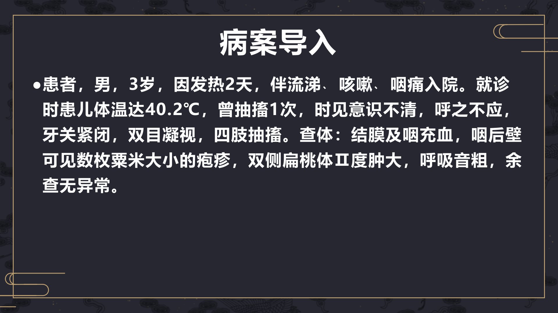 3岁男童因发热2天伴流涕、咳嗽、咽痛入院就诊时体温高达402并出现抽搐、意识不清等症状。查体显示结膜及咽充血咽后壁有疱疹双侧扁桃体肿大。高热是体温超过39的急性症状中医称“壮热”等外感常与感受风热等因素有关内伤则由脏腑功能失调所致。西医学中高热常见于急性感染等疾病。其辨证分型包括肺卫热盛、气分热盛、热入营血等。治疗上基本治法为清泻热邪以督脉、手阳明经穴等为主主穴包括大椎、曲池等配穴根据辨证分型选择。其他治疗包括耳针法、刮痧法等。针灸退热效果良好但须同时查明原因、明确诊断并配以相应治疗。本例患儿急用采血针点刺大椎等穴位放血同时给予抗感染及对症药物体温很快恢复正常。