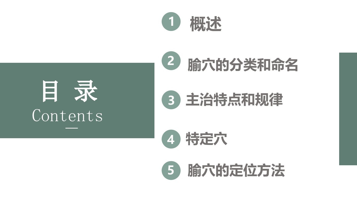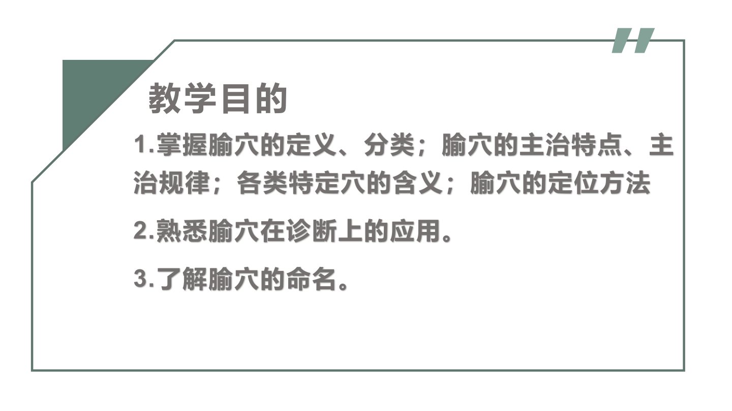 针灸推拿学院卢老师讲授腧穴总论教学目的有三:掌握腧穴定义、分类、主治特点与规律、特定穴含义及定位方法;熟悉腧穴在诊断上的应用;了解腧穴命名。腧穴是人体脏腑经络之气输注于体表的特殊部位分为十四经穴、经外奇穴、阿是穴三类。十四经穴归属于十二经脉和任、督脉有固定名称位置是主体;经外奇穴有名称位置但未列入十四经主治范围单纯对某些病证有特殊疗效;阿是穴无固定名称位置以压痛点等为施术部位。腧穴主治特点包括近治、远治和特殊作用。主治规律有分经和分部两种。特定穴包括五输穴、背俞穴等。腧穴定位方法有体表解剖标志定位法(固定和活动标志)、骨度折量定位法、指寸定位法(中指、拇指、横指同身寸)及简便定位法。