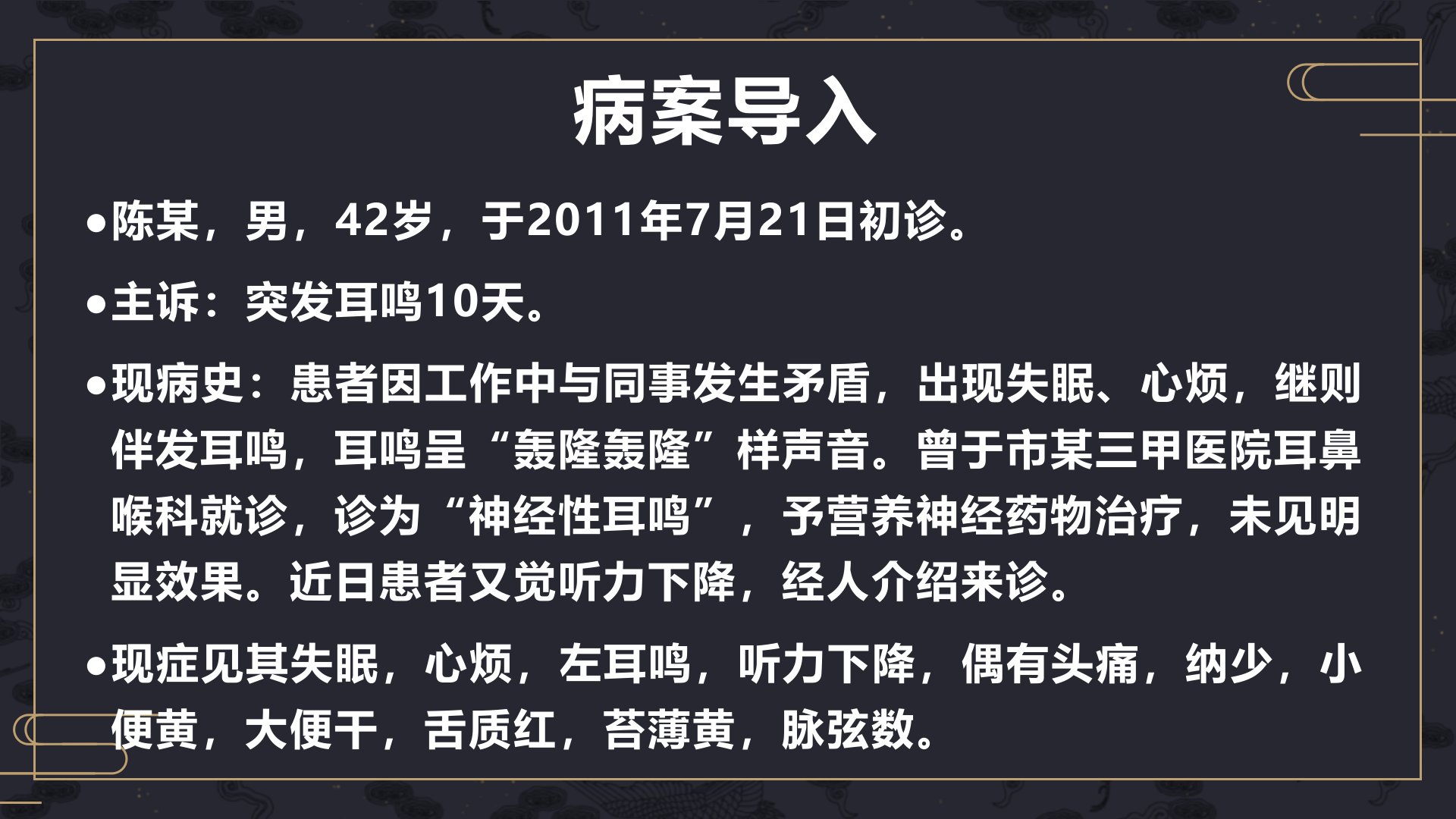 陈某男42岁因与同事矛盾突发耳鸣10天呈“轰隆”样声伴失眠、心烦近日听力下降曾于三甲医院诊为“神经性耳鸣”药物治疗无效后转中医治疗。现症见失眠心烦、左耳鸣、听力下降、头痛、纳少、二便异常舌红苔薄黄脉弦数诊断为耳鸣辨证属肝火上扰壅塞耳窍。耳鸣、耳聋与肝胆火旺等因素有关病位在耳与肝胆肾关系密切实证多因外感风邪或肝胆郁火虚证多因肾精亏虚。治疗上实证以疏风泻火、通络开窍为主取听会、翳风等局部穴及手足少阳经穴;虚证以补肾养窍为主取听宫、翳风等局部穴及足少阴经穴。该患者治则清泄肝火、通络开窍处方耳门、听宫等穴针刺用泻法。二诊耳鸣减轻加神门、三阴交镇静安神。三诊耳鸣明显减轻听力、睡眠改善。四诊针刺20次后耳鸣消失睡眠正常病愈随访1年未复发。