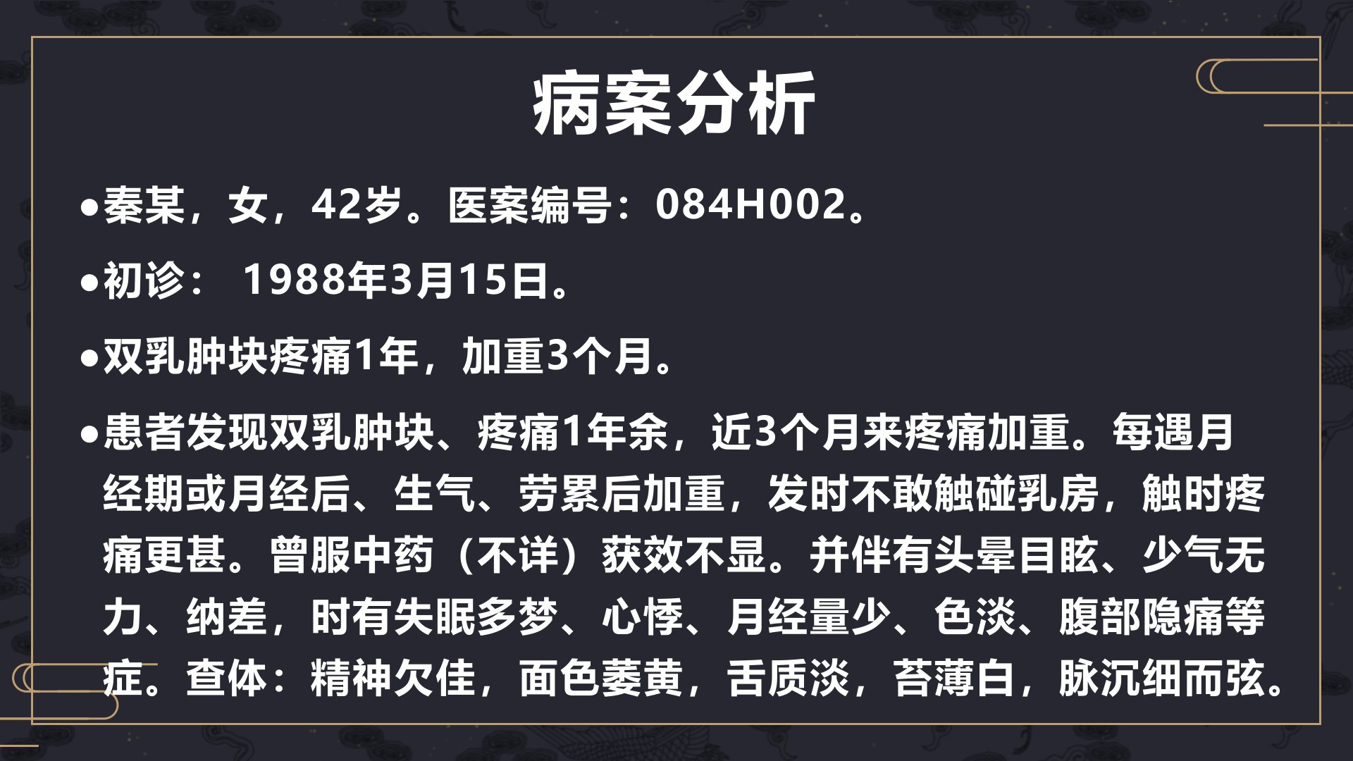 秦某女42岁医案编号084H0021988年3月15日初诊双乳肿块疼痛1年近3个月加重月经期或月经后、生气、劳累后尤甚触之疼痛更甚。曾服中药效果不显伴有头晕目眩、少气无力、纳差、失眠多梦、心悸、月经量少色淡等症状。查体见精神欠佳面色萎黄舌淡苔薄白脉沉细而弦左乳外上有3个15cm1cm肿块触压痛明显确诊为乳腺增生病。患者性情急躁加之脾胃虚弱、气血不足、肝气郁滞而发病。中医诊断为乳癖(肝气郁结气血亏虚)治宜补气血、疏肝气处方选用甲乙两组穴位交替针刺。经四个疗程治疗患者双乳疼痛消失肿块消失痊愈。本案患者系素性急怒、肝郁气滞致脾胃虚弱、气血不足乳房失养而痛辨证属气血双虚兼有肝郁治以补养气血、疏肝为法收效途中因失眠疼痛加重加刺神门等穴安神定志乳房、脾胃、肝心同治获良效。