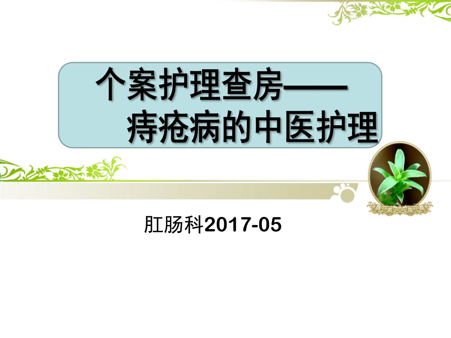 肛肠科个案护理查房摘要本次查房目的是了解责任护士对痔疮病人的病情评估及辩证施护落实情况提升专科护理水平。查房对象为46岁男性患者徐建国诊断为痔疮(湿热下注证)血栓性外痔。护理评估方面患者神色如常、精神尚可舌质红苔黄腻语言清晰饮食正常夜寐安宁大便后肛门有物脱出脉弦滑Barthel指数评分100分、疼痛评分2分实验室及辅助检查均无明显异常。护理措施上术前针对疼痛、焦虑、知识缺乏等问题采取了选择舒适卧位、热情接待、讲解疾病知识等措施;术后注意观察肛门疼痛程度取舒适体位遵医嘱予耳穴压豆、中药熏洗、微波治疗等并指导患者正确饮食、排便。讨论环节针对患者情况探讨了如何更好地做好疼痛护理包括情志护理、中药熏洗、耳穴压豆、饮食调护、环境护理及微波治疗等。查房结果显示患者焦虑情绪缓解对疾病知识基本了解术后疼痛评分降低。责任护士准备充分护理措施落实到位患者对护理工作满意。