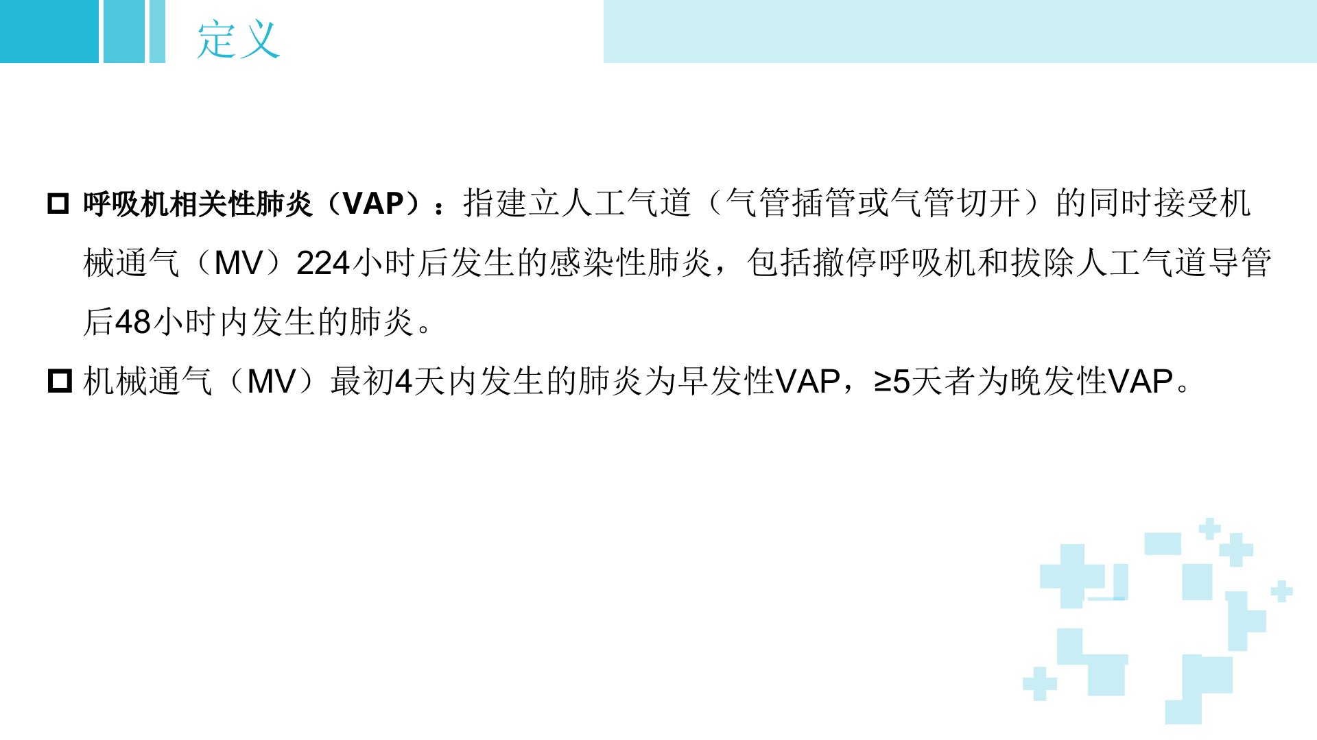 呼吸机相关性肺炎(VAP)指建立人工气道并接受机械通气24小时后发生的感染性肺炎早发性VAP发生于机械通气最初4天内5天以上为晚发性VAP致病菌以革兰氏阴性杆菌最常见也可由真菌感染引起。机械通气期间病人出现发热、气管内吸出脓性分泌物、涂片染色见细菌、白细胞增多、深部痰培养致病菌、X线片出现新渗出性病灶、动脉血氧分压不明原因下降等情况可判定为VAP。预防VAP的护理措施包括:加强人工气道管理保持呼吸道通畅和有效气道湿化做好气囊管理;呼吸机管道每周更换及时清除冷凝水使用一次性管路每天评估是否撤机;加强口腔护理每天3次根据口腔PH值选择清洗液;防止胃肺逆行感染抬高床头确保鼻饲管插入胃内;防止交叉感染严格洗手、无菌操作控制探视;加强对高危人群支持性护理做好保护性隔离结合病情采用肠内或肠外营养。
