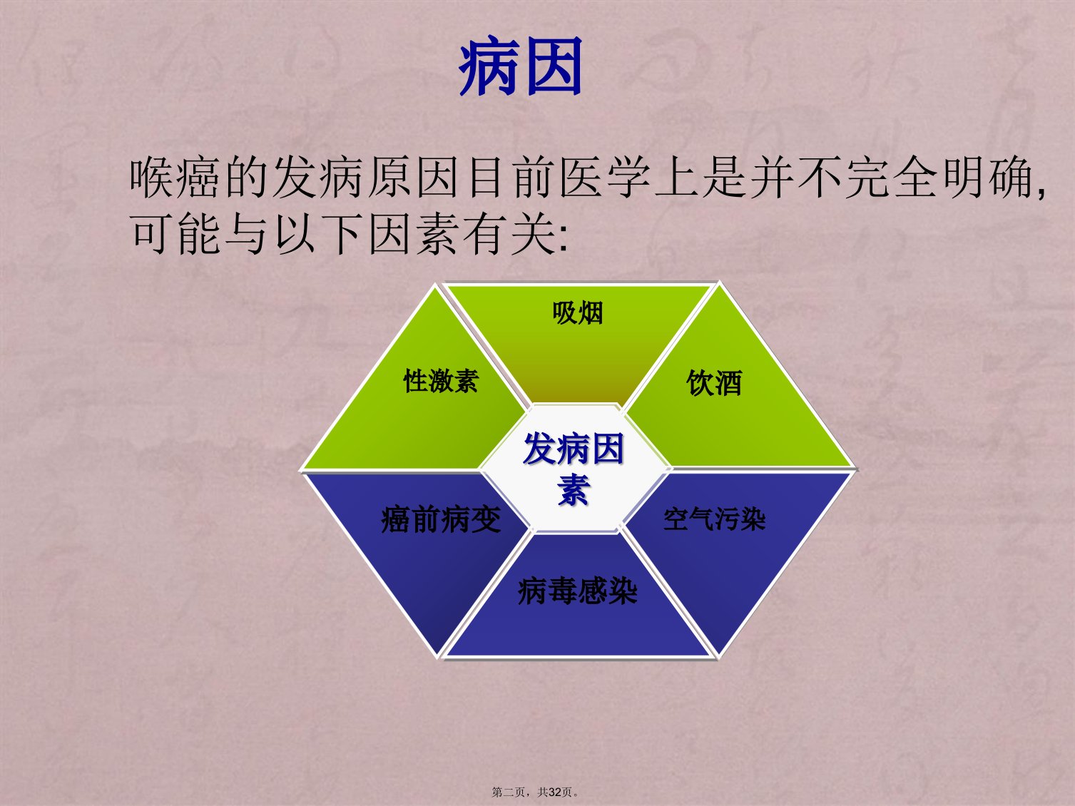 喉癌发病原因尚不完全明确可能与吸烟、饮酒、空气污染、病毒感染、性激素等因素有关。喉癌临床分型有声门上型、声门型、声门下型和声门旁型症状包括声音嘶哑、呼吸困难、疼痛、吞咽困难等。治疗方法包括手术、生物治疗、放射治疗及辅助化疗。以52岁男性声门上型喉癌患者为例患者发现颈部包块20天伴有咽痛。专科检查示会厌及舌根处有肿物右侧颈部有椭圆形肿物。入院后完善检查确诊后行TPF诱导化疗随后进行全麻下手术治疗包括喉水平部分切除术、双侧颈淋巴清扫术等。术前护理针对患者焦虑、恐惧及知识缺乏的问题通过安慰、解释、心理护理和术前宣教使患者情绪稳定并对疾病有了一定认识。术后护理重点包括清理呼吸道、控制出血、防止导管脱落、缓解疼痛及营养支持通过气管套管护理、管道护理、基础护理、伤口护理、疼痛护理及饮食护理等措施患者恢复良好。出院时指导患者正确护理气管套管告知复查时间强调不去空气污染重的地方。
