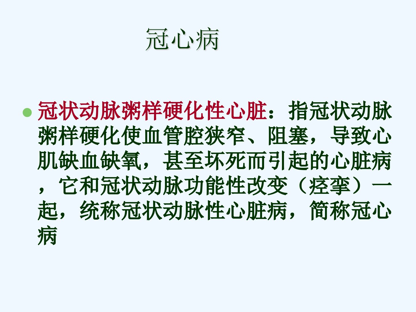冠心病指冠状动脉粥样硬化使血管腔狭窄、阻塞导致心肌缺血缺氧甚至坏死而引起的心脏病其病因包括高年龄(40岁以上多见49岁后进展快)、高血脂、高血压、高血糖、高体重以及性别、吸烟、饮食、职业、遗传、A型性格等因素。心绞痛是冠状动脉供血不足导致心肌急剧、暂时缺血缺氧的临床综合征以发作性胸痛为主要表现。心肌梗死是冠心病的严重类型因冠状动脉血供急剧减少或中断导致心肌坏死。护理评估需关注基本病因及主要症状如疼痛特点(无诱因、休息时发生、程度重、持续时间长等)及全身症状。冠心病的社区护理包括一、二、三级预防。居家护理则需注意居住环境、营养与饮食、适量运动(病情稳定无并发症者第6周后可步行、打太极拳等)、用药护理及健康教育如洗澡注意事项、消化不良症状警惕等。