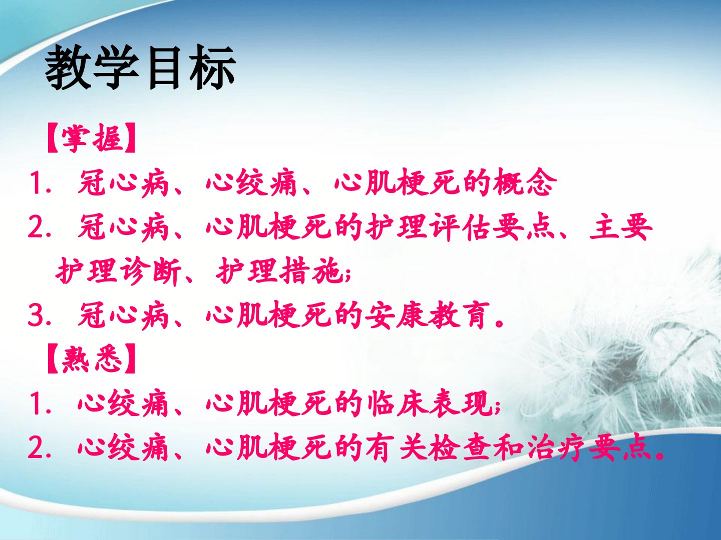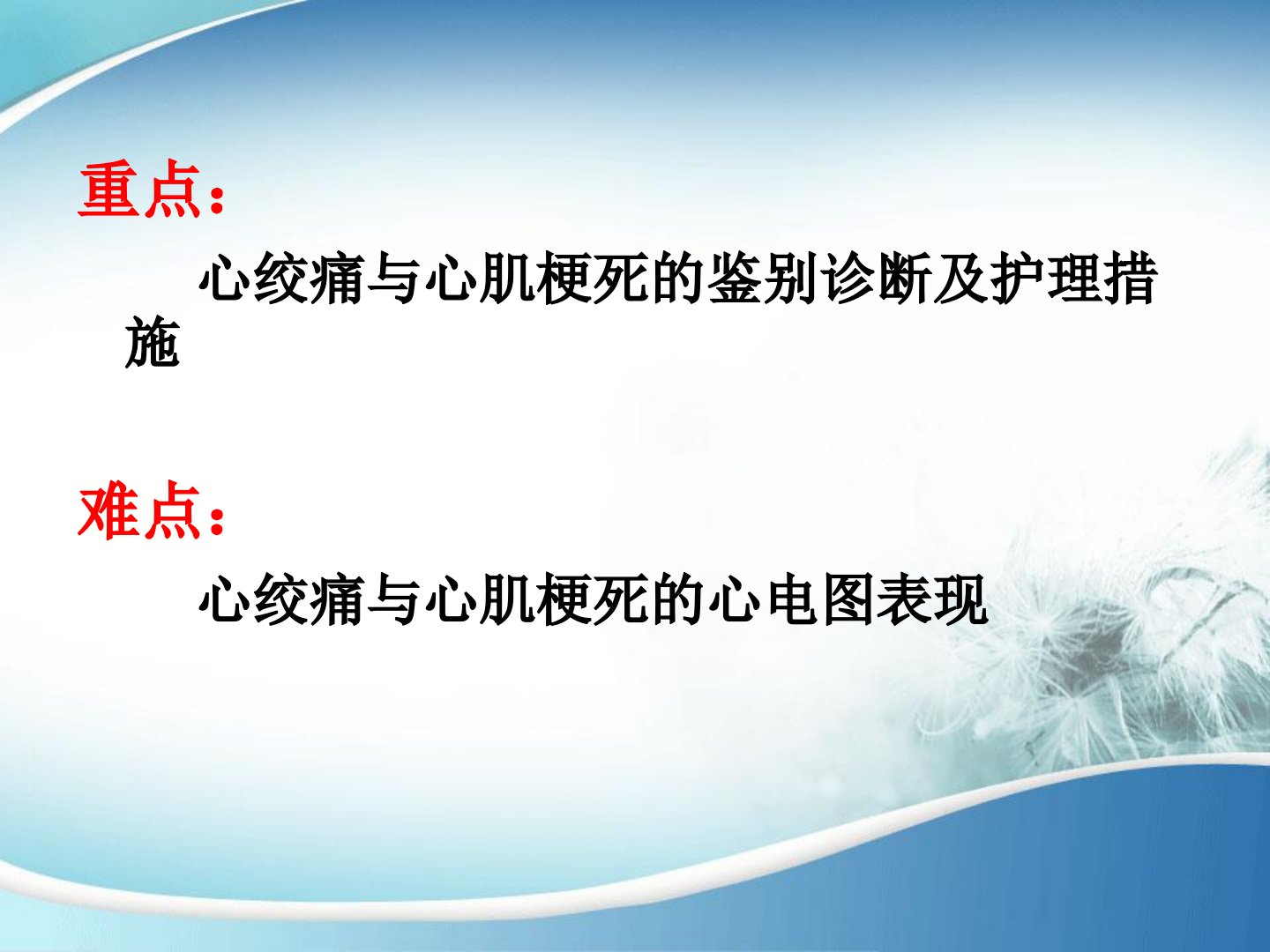 第二章冠心病病人的护理摘要教学目标掌握冠心病、心绞痛、心肌梗死概念及护理要点;熟悉临床表现、检查和治疗要点。重点在于心绞痛与心肌梗死的鉴别诊断及护理难点为两者心电图表现。冠心病概述冠状动脉粥样硬化性心脏病简称冠心病由冠状动脉粥样硬化导致心肌缺血、缺氧或坏死引起。病因和发病机制确切病因不明可能与遗传、环境(如吸入性变应原、感染、食物、药物、气候等)有关。发病机制涉及炎症细胞、细胞因子及介质相互作用致气道炎症、气道高反应性等。临床表现典型症状为发作性呼吸困难、胸闷和咳嗽夜间及凌晨加重。体征包括胸部过度充气征、广泛哮鸣音。分期包括急性发作期、慢性持续期和缓解期。辅助检查包括肺功能检查、血气分析、胸部X射线检查等。护理评估发病原因、临床表现、家族史等。护理目标为缓解呼吸困难、有效呼吸、排痰、正确使用雾化吸入器预防并发症。护理措施包括一般护理、病情观察、对症护理、用药护理、心理护理及健康指导等。