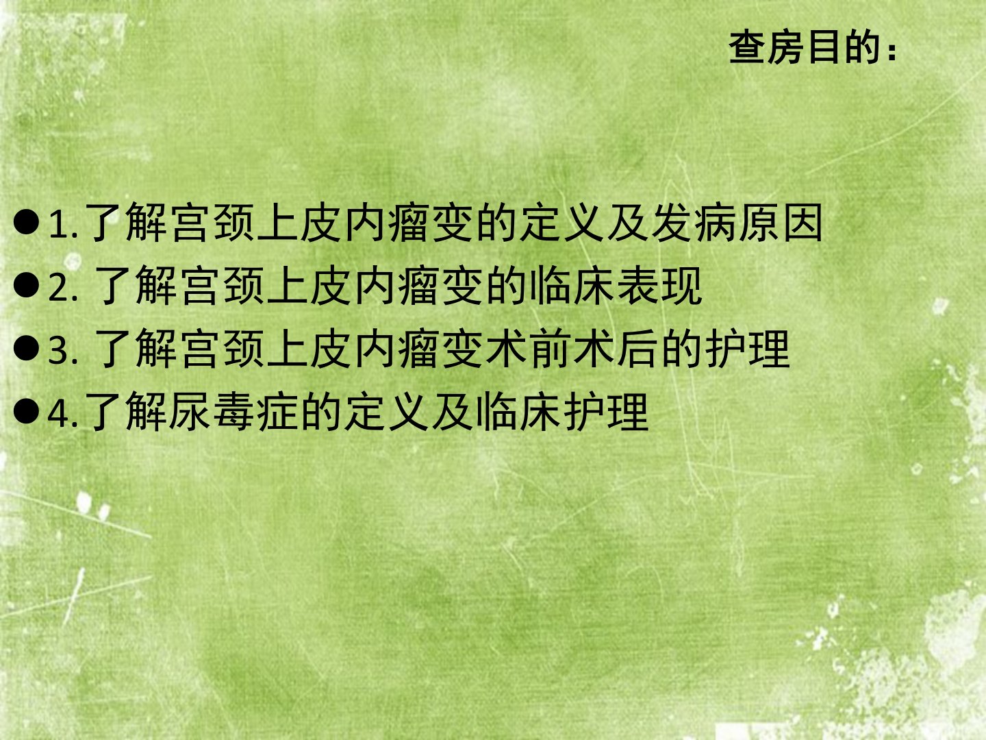 宫颈CIN护理查房摘要本次查房旨在了解宫颈上皮内瘤变(CIN)及尿毒症相关知识包括定义、病因、临床表现、护理等。病例患者刘长风54岁诊断为宫颈高级别鳞状上皮内肿瘤、尿毒症有高血压、青霉素头孢类过敏史等。护理问题有紧张焦虑、知识缺乏等。护理措施包括:做好入院宣教给予心理支持;讲解疾病知识增强信心;提供安静环境;嘱营养饮食。患者术前准备后行宫颈冷刀锥切术术后入复苏室观察。术后护理问题有疼痛、自理能力缺陷、感染危险等针对不同问题采取相应护理措施如协助体位、加强协助、保持外阴清洁等。护理评价显示患者未发生感染术后病情平稳出院。CIN是子宫颈癌癌前病变病因包括HPV感染等多数无自觉症状。尿毒症是肾功能不全严重阶段症状有效治疗方法为血液透析和腹膜透析。讨论认为宫颈癌可预防要加强健康教育定期筛查积极治疗宫颈病变。