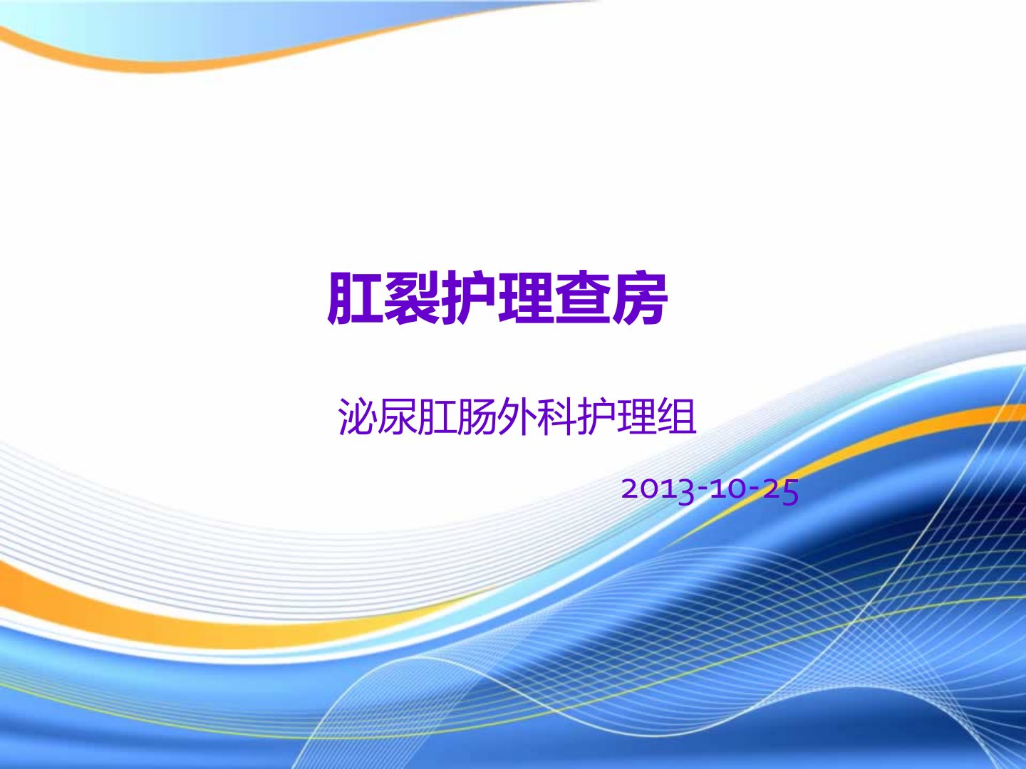 2013年10月25日泌尿肛肠外科护理组进行了肛裂护理查房。患者朱艳华33岁女性因大便疼痛伴鲜血2个月就诊诊断为肛裂并于2013年10月24日行肛裂切除术及内括约肌切断术。肛裂是齿状线以下肛管皮肤层裂伤后形成的溃疡常见于中青年多由慢性便秘、粪便干硬引起。治疗包括软化大便、解除肛门括约肌痉挛、非手术治疗(如服用通便药物、局部坐浴、扩肛疗法)及手术治疗。护理诊断包括疼痛、便秘及潜在并发症(切口出血、尿潴留、大便失禁等)。护理措施有有效缓解疼痛、保持肛门卫生、中药坐浴、口服止痛药;保持大便通畅调理饮食多饮水增加膳食纤维摄入;术后需预防并发症如保持大便通畅以防切口出血鼓励早期排尿以防尿潴留密切观察排便情况以防大便失禁。