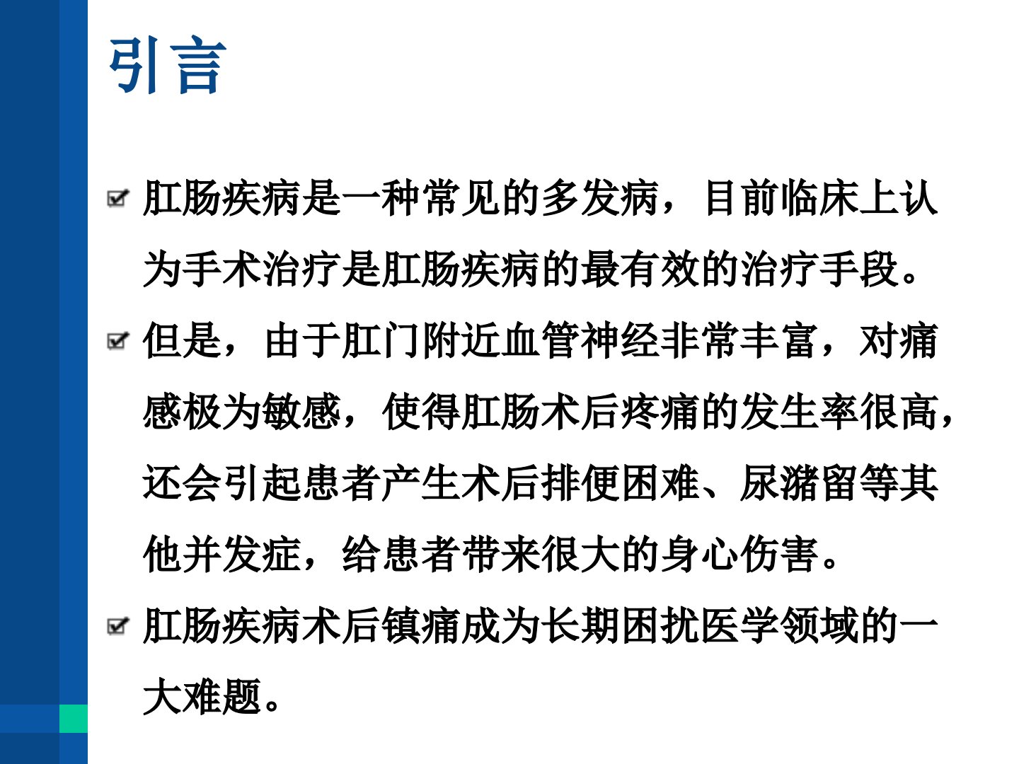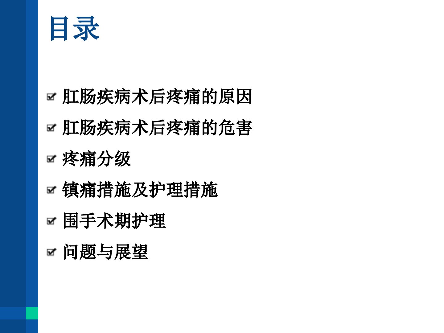 肛肠病术后镇痛的护理摘要肛肠疾病作为常见多发病手术治疗虽有效但术后疼痛发生率高。原因主要有肛门内括约肌痉挛包括周围组织受手术刺激、致痛物质释放、创面水肿感染等还有手术麻醉不全、患者精神紧张、粪便刺激伤口等因素。术后疼痛危害大会导致明显应激反应如心率加快、血压升高等还会引发并发症如呼吸障碍、肺部并发症等影响术后恢复和免疫力。世界卫生组织将疼痛分为010级。镇痛措施上药物镇痛分非阿片类和阿片类各有适用范围和副作用;自控镇痛通过泵自注小剂量药物按需止痛有静脉、皮下等途径;超前镇痛在切皮前给药有多种药物及给药方式;平衡镇痛是不同药物联合减小副作用;硬膜外镇痛效果显著需制定常规。围手术期护理包括心理、饮食疗法及健康教育。目前术后镇痛方法多样各有利弊中医镇痛有一定成果但周期长中西医结合是未来研究方向。