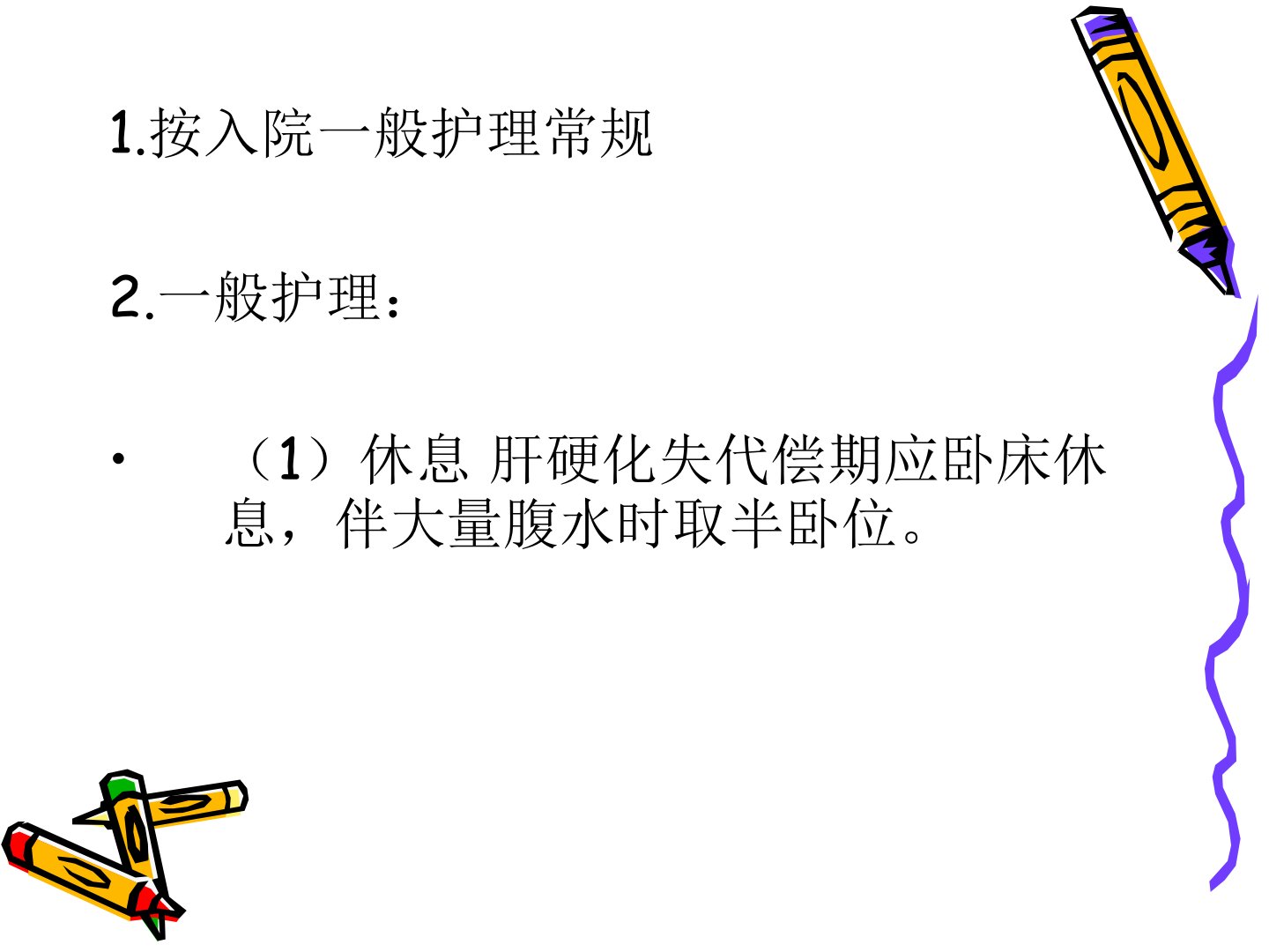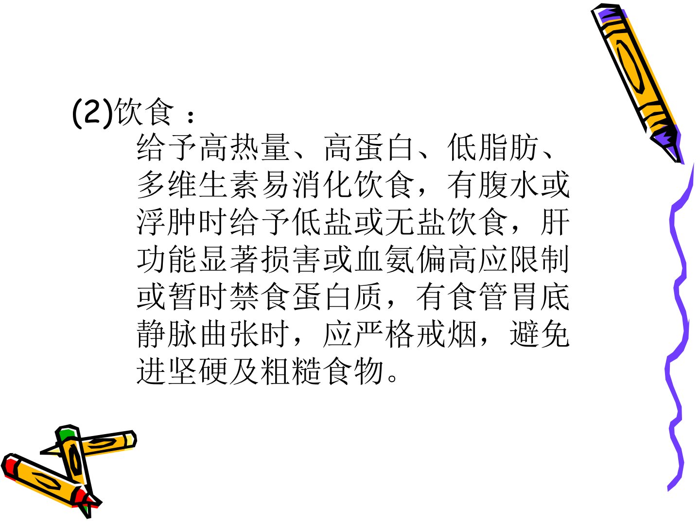 肝硬化护理要点如下:1常规护理:按入院一般护理常规处理。2一般护理:失代偿期应卧床休息伴大量腹水取半卧位;给予高热量、高蛋白、低脂肪、多维生素易消化饮食有腹水或浮肿低盐或无盐肝功能差或血氨偏高限制或禁食蛋白质有食管胃底静脉曲张严格戒烟、避免坚硬粗糙食物;大量腹水、全身浮肿者保持皮肤清洁干燥防压疮;准确记录出入量每日测腹围与体重。3病情观察:观察生命体征注意精神、性格、行为变化警惕肝性脑病;观察呕吐物及大便颜色性状警惕消化道出血;应用利尿剂时注意水、电解质平衡。4健康教育:生活规律保证睡眠禁酒及刺激性食物保持大便通畅避免用肝损药物注意个人卫生防感染。