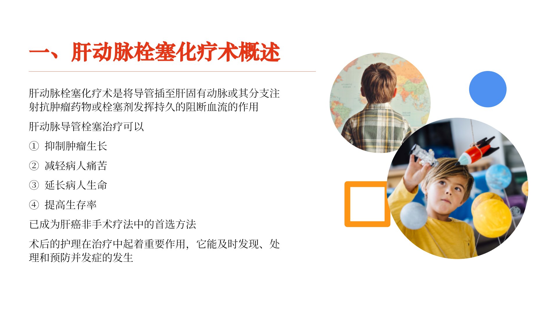 肝动脉栓塞化疗术是肝癌非手术疗法的首选通过导管注射抗肿瘤药物或栓塞剂阻断血流以抑制肿瘤生长。护理在治疗中起重要作用。术前需进行心理护理向病人及家属解释手术过程取得理解与支持并做好术前检查、碘过敏试验、备皮及禁食等准备。术后护理包括:心电监护观察穿刺处有无渗血、血肿;对疼痛、发热进行及时护理;监测血象及时处理不良反应;对特殊药物如索拉非尼、平阳霉素的不良反应进行观察与护理;加强保肝护肝治疗;预防出血严格执行无菌操作;加强口腔护理。恶性肿瘤给患者带来极大压力和痛苦积极有效的控制肿瘤生长、提高患者生存率是研究重点通过治疗过程中的护理可帮患者树立信心延长生存期提高生活质量。