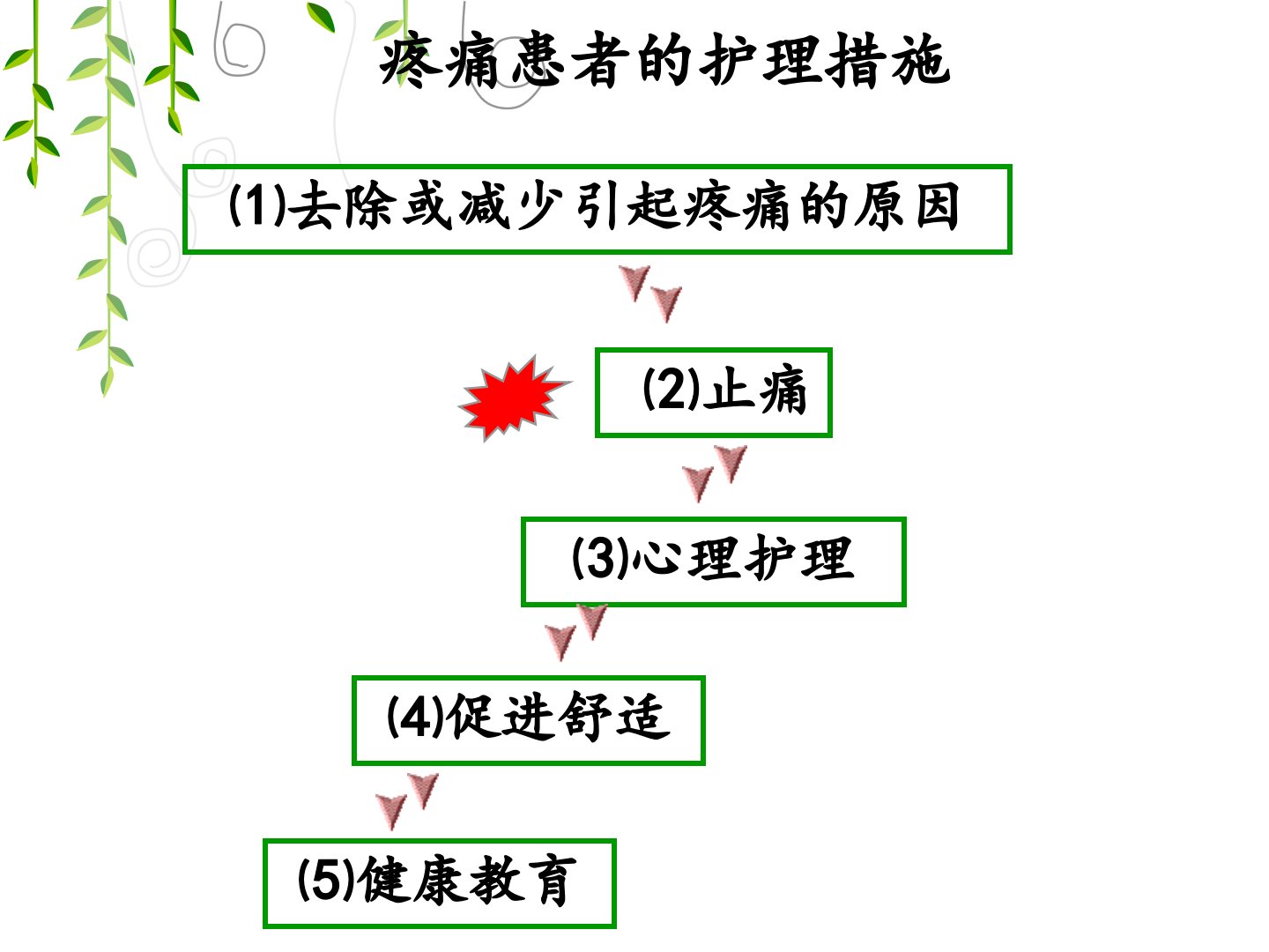 WHO疼痛治疗用药有三阶梯方案:重度疼痛(710分)用III强阿片类药、弱阿片类药及辅助药;中度疼痛(46分)用弱阿片类药、非阿片类药及辅助药;轻度疼痛(13分)用I非阿片类药及辅助药。妇科疼痛中痛经指女性经期前后或行经期间出现以疼痛为主的一组症状分为原发性和继发性原发性痛经病因尚不明确与多种因素有关。慢性盆腔疼痛是妇科常见症状病因复杂常见为盆腔炎症、子宫内膜异位症等不同病因有不同治疗方法。妇科腹腔镜术后非切口疼痛多表现为肩部、膈下、肋间及腹部胀痛36h内多发与使用CO建立气腹有关。对妇科腹腔镜患者术后采用穴位按摩、增加膝胸卧位训练等个性化疼痛护理措施能显著减轻术后非切口疼痛。