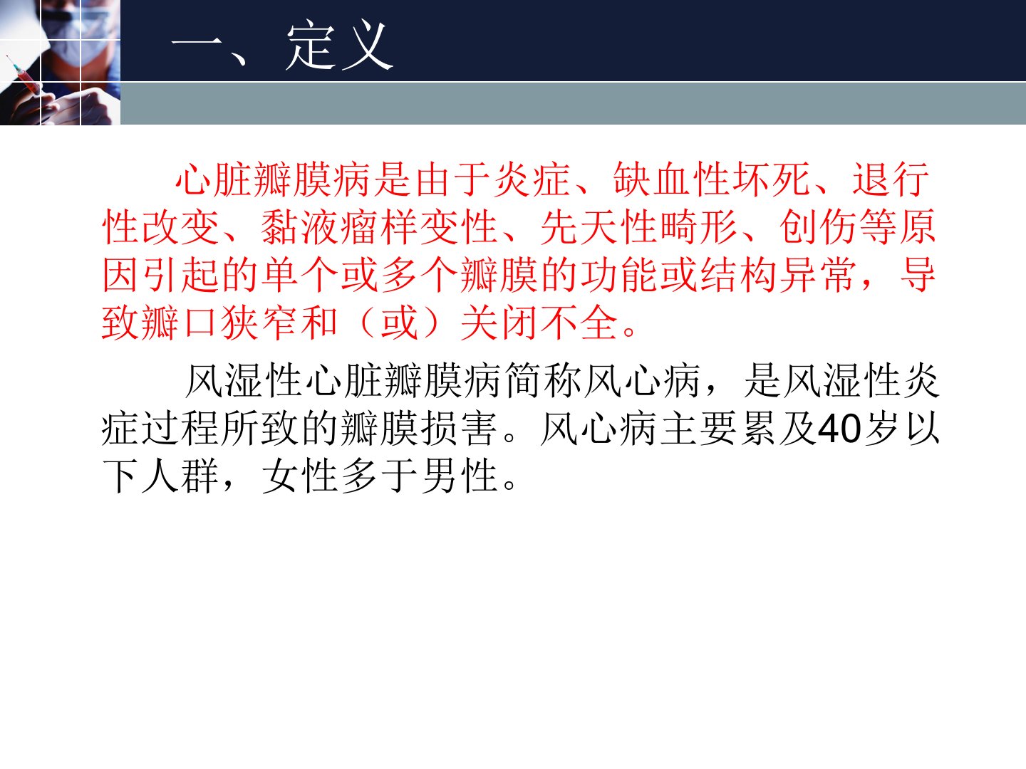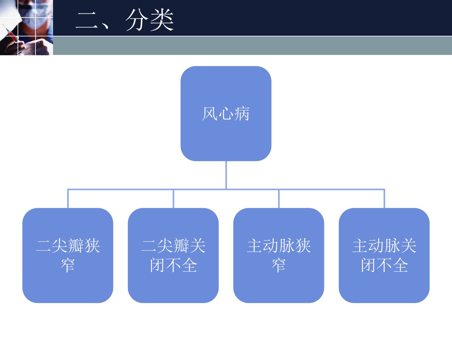 风湿性心脏病摘要风湿性心脏瓣膜病简称风心病是风湿性炎症导致的瓣膜损害主要影响40岁以下人群女性患者多于男性。一、病因二尖瓣狭窄、关闭不全及主动脉瓣狭窄最常见病因均为风湿性炎症。约三分之二的主动脉瓣关闭不全为风心病所致。二、临床表现1二尖瓣狭窄:症状包括呼吸困难、咳血、咳嗽、声音嘶哑等体征有“二尖瓣面容”、心尖区杂音等并发症有心房颤动、心力衰竭等。2二尖瓣关闭不全:轻度者可能终身无症状重度者则有心排血量减少等症状并发症与二尖瓣狭窄相似。3主动脉瓣狭窄:症状有呼吸困难、心绞痛、晕厥等体征包括心尖搏动局限等并发症有心内膜炎等。4主动脉瓣关闭不全:早期可无症状晚期出现左心衰竭并发症包括感染性心内膜炎等。三、诊疗计划包括一般治疗、病因治疗、病理生理治疗、治疗房颤等。四、护理措施提供适宜环境合理饮食氧疗正确用药避免诱因病情观察心理疏导等。五、健康指导包括疾病知识指导、预防感染、避免诱因等。