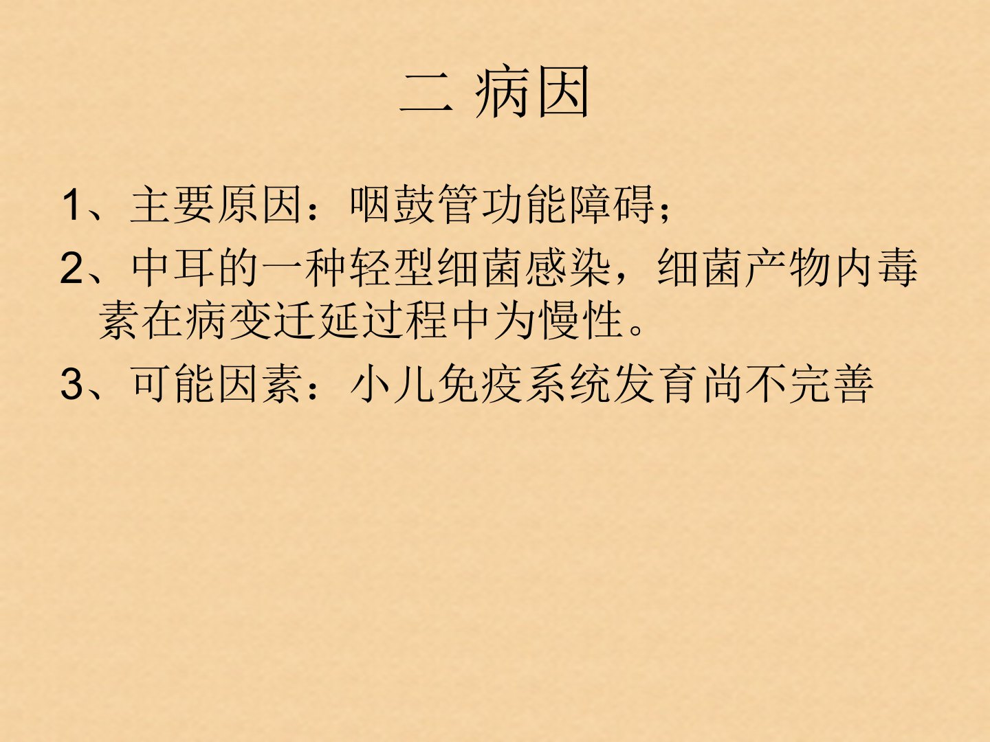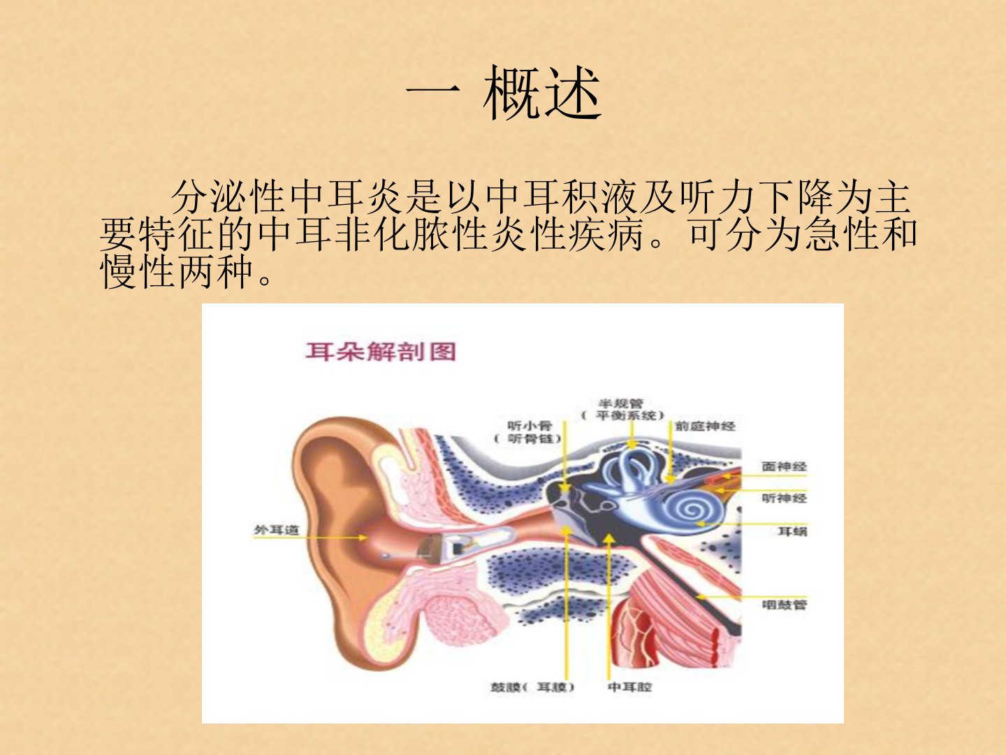 分泌性中耳炎是以中耳积液及听力下降为特征的非化脓性炎性疾病分急、慢性两种。主要病因是咽鼓管功能障碍中耳轻型细菌感染及细菌产物内毒素会致慢性病变小儿免疫系统不完善是可能因素。症状包括听力下降伴自听感增强急性患者有耳痛、耳内闷塞感、低音调间歇性耳鸣等。辅助检查有鼓膜表现、听力检查、耳部CT扫描。护理问题包括感知改变、知识缺乏、舒适状态改变等。护理目标为听力恢复、了解疾病预防及术后保健知识、增加舒适度。护理措施分术前术后术前包括心理护理、术前准备和宣教;术后包括体位、饮食、病情观察等。出院后患者需注意通气管留置时间、避免污水入耳、勿自行挖耳、掌握正确擤鼻和滴耳方法、营养均衡增强体质。
