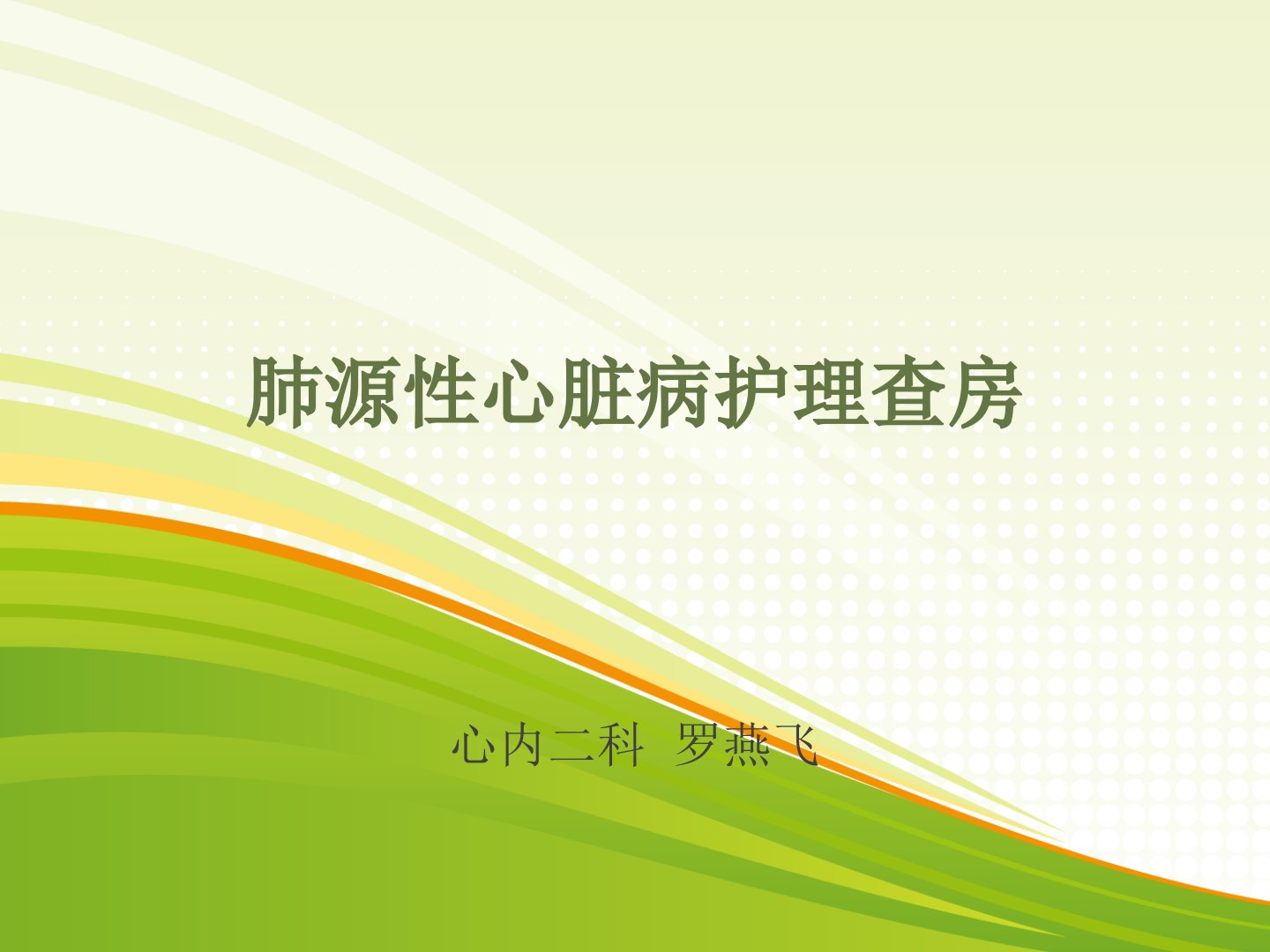 心内二科罗燕飞进行肺源性心脏病护理查房患者为80岁老年男性病程10余年因活动后胸闷、气促入院有慢性阻塞性肺疾病、高血压病、脑梗塞、动脉硬化症等病史。查房显示患者急性重病容口唇稍发绀双下肺可闻及湿性啰音心界向左扩大双下肢重度凹陷性水肿。入院后给予心内科护理常规低盐低脂饮食告病重监测生命体征持续低流量吸氧间断无创呼吸机辅助呼吸以及阿司匹林抗血小板聚集、辛伐他汀稳定斑块等药物治疗。辅查显示血气异常、生化指标异常、心脏左室肥厚等。护理问题包括气体交换受损、清理呼吸道无效、活动无耐力、体液过多等分别采取保持空气新鲜、指导排痰、有计划护理、限制饮食等措施。潜在并发症有肺性脑病、电解质紊乱需持续低流量低浓度给氧、观察病情。患者还有皮肤完整性受损危险需建立压疮风险评估单。出院指导包括长期家庭氧疗、饮食调整、预防感染、遵医嘱服药、定期随访。