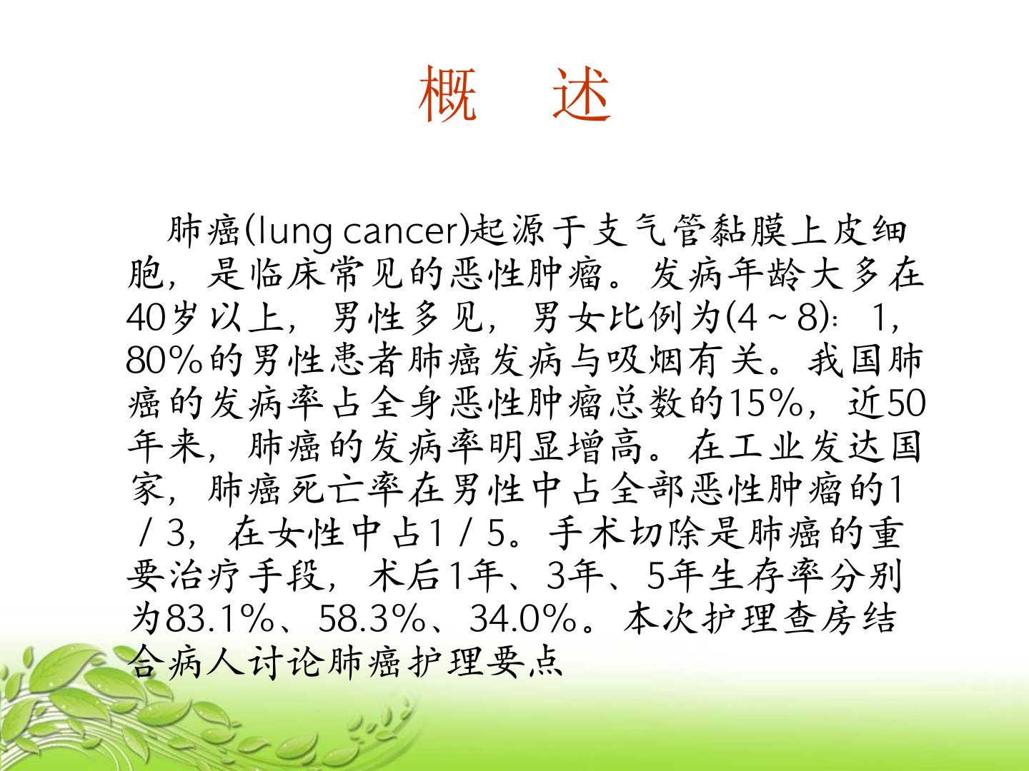 肺癌术后病人护理查房摘要肺癌源于支气管黏膜上皮细胞是常见恶性肿瘤40岁以上男性多发多与吸烟有关我国发病率占全身恶性肿瘤总数的15手术切除是重要治疗手段。本次护理查房围绕病人展开该病人因“排尿不畅、尿频、尿不尽两月”入院门诊查胸部CT示右下肺占位后行右肺中下叶切除术。护理评估涵盖病史、查体、实验室及辅助检查。术前护理需向患者解释手术重要性调整心理状态协助检查做好戒烟、口腔卫生、有效咳嗽等准备。护理诊断包括清理呼吸道低效、舒适状态改变、活动无耐力及潜在并发症。术后护理要注意体位、饮食、吸氧严密监测生命体征做好呼吸道护理保持胸腔引流管通畅鼓励早期活动。并发症护理涉及大出血、张力性气胸、肺不张、肺炎等多种情况。健康教育方面指导患者进行功能锻炼如练习呼吸、有效咳嗽进行抬肩抬臂活动并鼓励有效排痰。