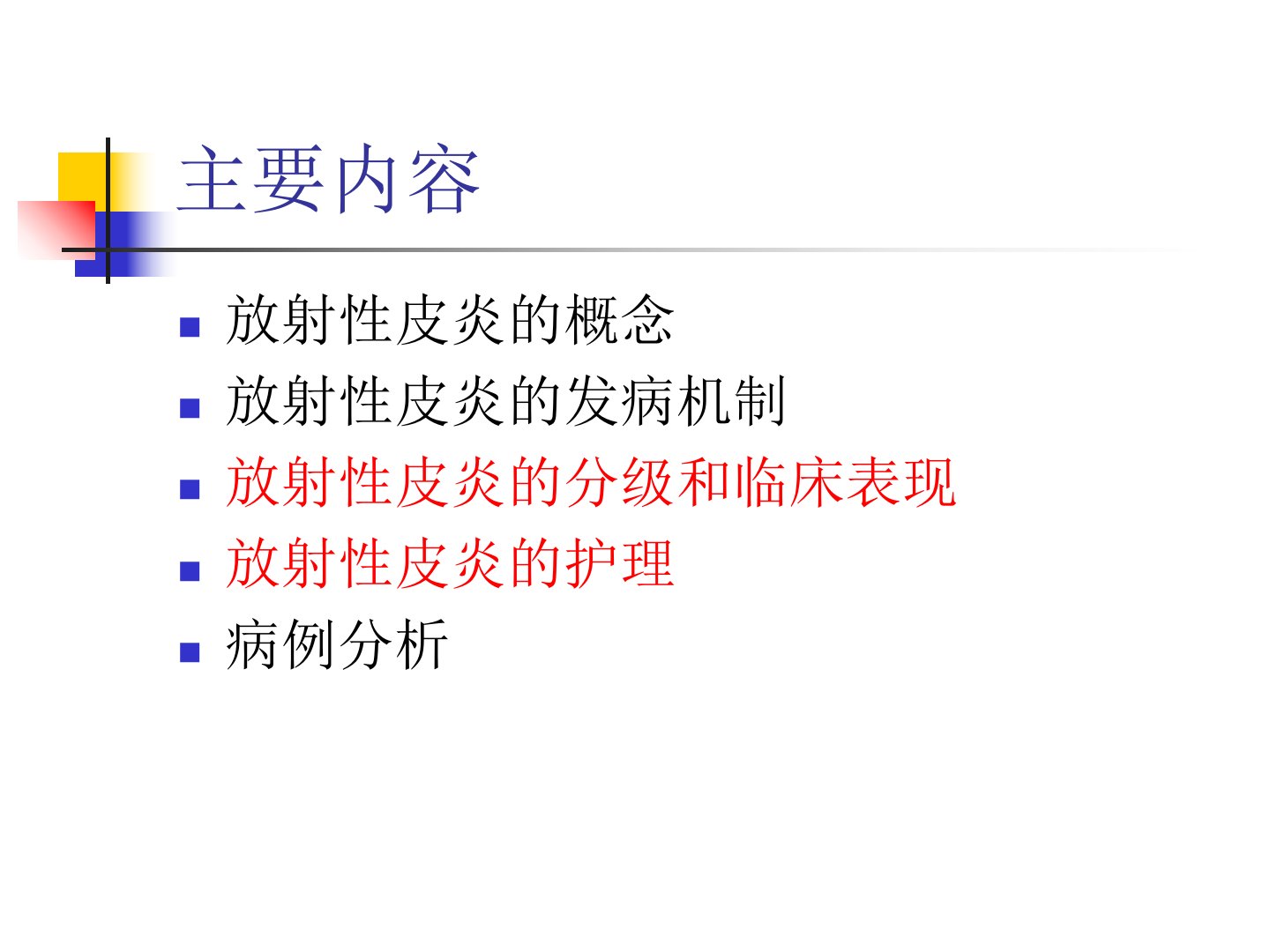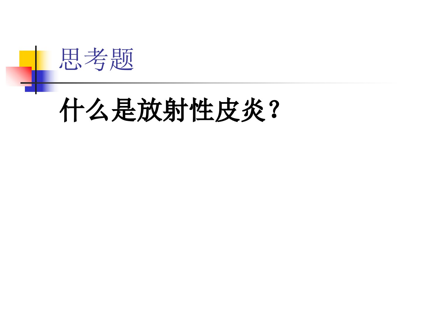 放射性皮炎是由于放射线照射引起的皮肤粘膜炎症性损害多见于接受放射治疗的患者及防护不严的放射工作者是肿瘤放疗的常见并发症。轻者表现为红斑、色素沉着等重者则出现皮肤出血、水肿、溃疡等。其发病机制涉及放射线照射后皮肤毛细血管的反应性改变导致微血管扩张、充血进而形成红斑严重时出现糜烂和溃疡。放射性皮炎分急性和慢性急性又分三度:一度为干性皮炎表现为红斑等;二度为湿性反应出现充血、水肿等;三度为放射性溃疡真皮层受损难愈。慢性皮肤反应则表现为皮肤萎缩、变薄等。护理上一度可用冰片滑石粉等涂撒;二度可用比亚芬乳膏等涂擦或湿敷;湿性皮炎合并感染则需清洗脓液后涂擦药膏暂停放疗并加用抗生素。病例分析中的患者属二度放射性皮炎护理需保持皮肤清洁干燥避免刺激同时注重心理和饮食护理。