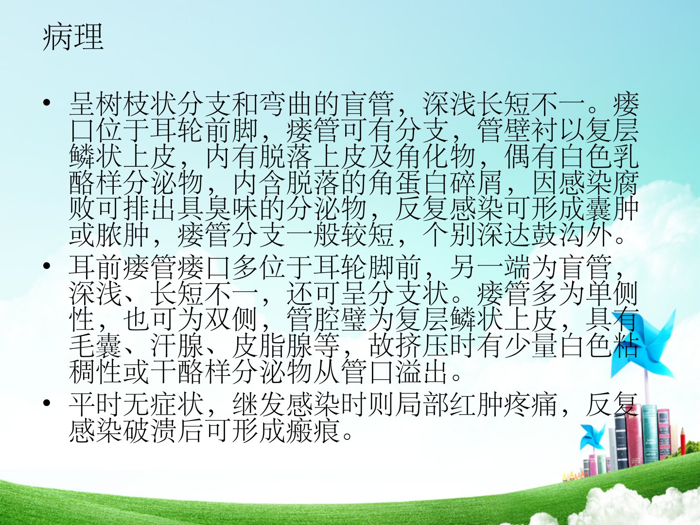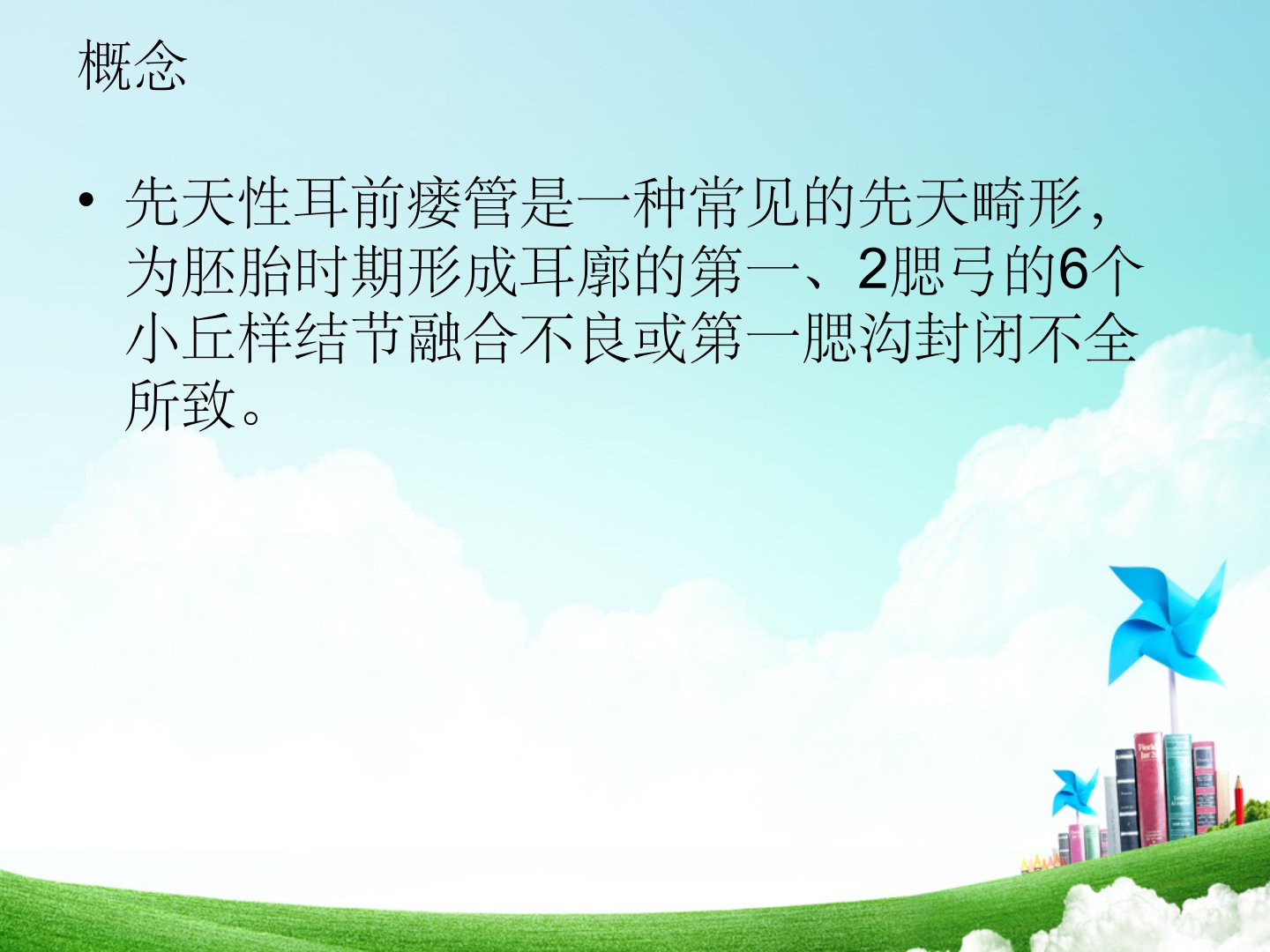 先天性耳前瘘管是常见先天畸形由胚胎时期耳廓发育不良所致病理呈树枝状分支盲管多为单侧偶有双侧平时无症状感染时则红肿疼痛反复感染破溃可形成瘢痕。治疗上无感染者无需处理急性感染时用抗生素控制脓肿则切开引流感染控制后行瘘管切除术。患者熊宁15岁因“自幼发现右耳前瘘管反复红肿、疼痛、流脓6月”入院诊断为右耳前瘘管伴感染2月1日在全麻下行右耳前瘘管切除术手术顺利。护理诊断包括知识缺乏、疼痛、焦虑及感染危险。护理目标为使患者掌握自我护理知识、减轻疼痛、预防感染、保持心情舒畅。护理要点含术前心理护理、完善检查术后观察生命体征、定期换药、注意休息、加强营养及健康指导。