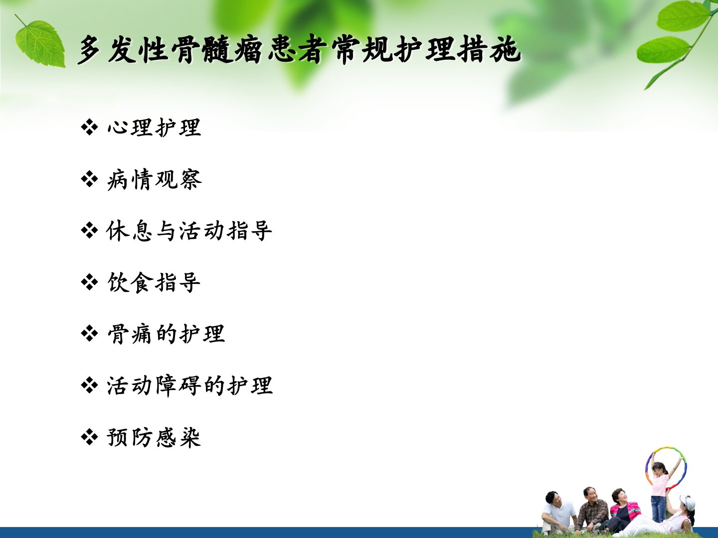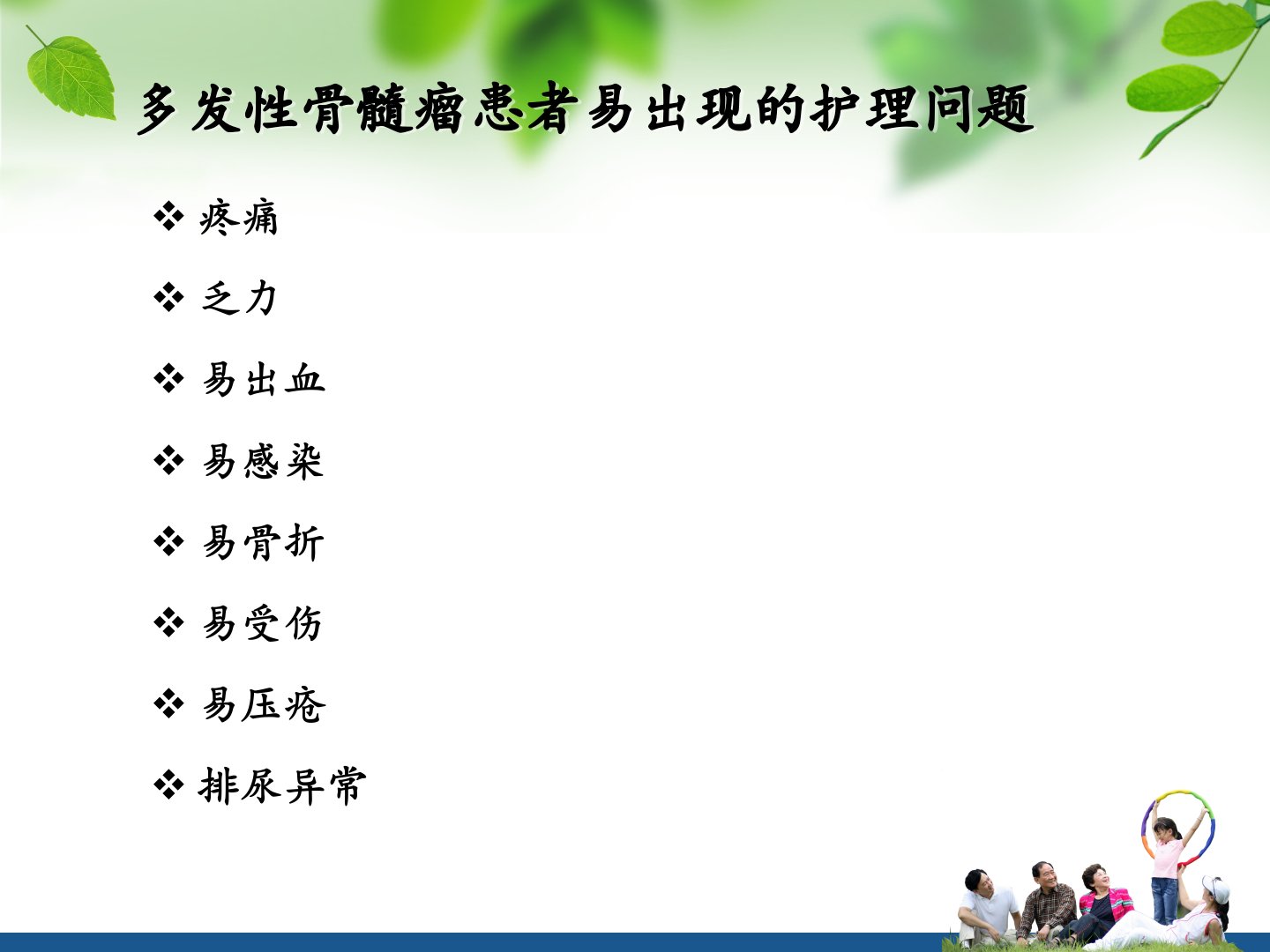 多发性骨髓瘤患者易出现疼痛、乏力、易出血、感染、骨折、排尿异常等问题需全面护理。护理措施包括:1心理护理:患者常伴恐惧、焦虑等心理问题需适时调节心理状态良好心情是治愈前提。2病情观察:严密观察骨痛部位、性质及时处理病理性骨折;监测高钙血症、贫血、出血、肾功能变化。3休息与活动:睡硬板床加海绵垫避免剧烈活动搬动时轻稳准防止骨骼扭曲。4饮食指导:高热量、高维生素、高钙、高蛋白、低钠饮食戒除烟酒多摄取粗纤维食物推荐升白细胞、缓解血小板减少症的食谱。5骨痛护理:取舒适卧位采用皮肤刺激法、情境处理法、药物止痛等减轻疼痛。6活动障碍护理:鼓励患者适度活动使用辅助器具注意安全瘫痪患者定时变换体位防止压疮。7预防感染:养成良好卫生习惯保持环境整洁合理使用抗生素严格无菌操作监测体温骨髓受抑严重时考虑保护性隔离。8PICC维护:定期换药多活动带管侧肢体妥善固定导管避免提重物等沐浴时包裹好导管。