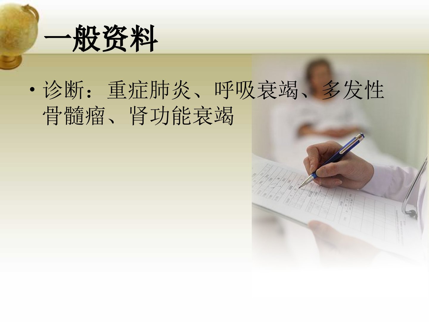 护理查房一般资料诊断:重症肺炎、呼吸衰竭、多发性骨髓瘤、肾功能衰竭治疗经过2月无明显诱因出现腰背痛,在门诊行针灸,未行系统治疗6月考虑多发性骨转移7月18日考虑左侧肋骨肿瘤、多发性骨转移,收入我院胸外科治疗经过7月19日患者出现呕吐、嗜睡生化回示肾衰,行床旁血透7月22日患者出现呼吸困难、氧饱和下降,给予氧流量10升/分,真菌感染。7月26日诊断多发性骨髓瘤、肾功不全、肺部感染治疗经过7月29日转肿内一治疗7月30日发绀明显、呼吸困难,转RICU治疗。行机械通气,A/C模式。7月31日改为SIMV模式8月4日改为自主模式8月5日改用BIPAP无创通气8月12日转地方医院治疗辅助检查-红细胞数目...