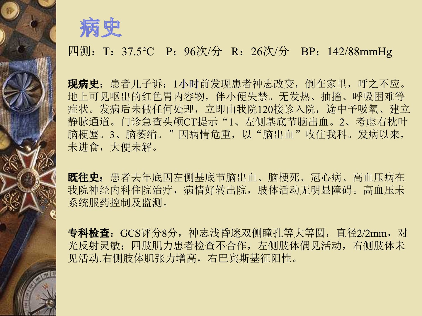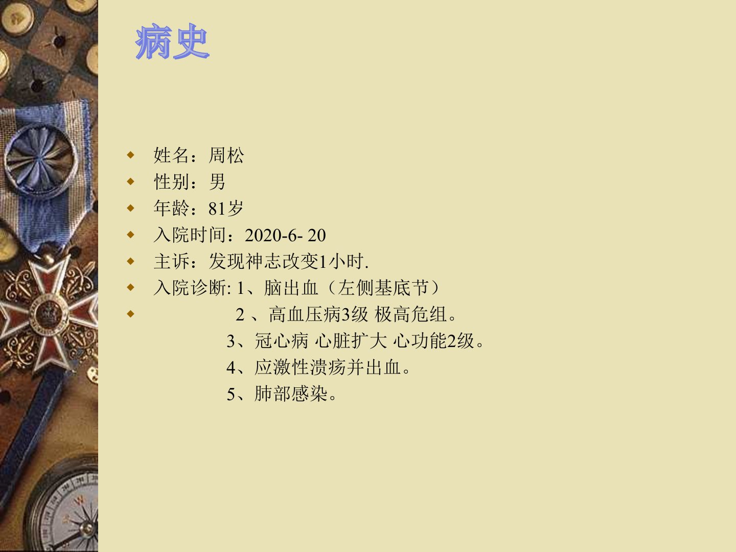 低血容量性休克护理查房摘要患者周松81岁男性因“发现神志改变1小时”入院诊断包括脑出血、高血压病3级极高危组、冠心病、应激性溃疡并出血及肺部感染。患者有高血压及脑出血病史未系统服药。此次发病神志浅昏迷伴有呕血、小便失禁。入院后病情危重出现低热、血性痰液左侧基底节脑出血大于30ml暂未破入脑室。治疗中患者神志时有变化肌力、肌张力也有改变且出现大便拉稀、菌群失调、肾功能不全、血尿等症状经调整治疗方案后病情有所稳定。但6月27日晨患者出现低压性休克考虑与冠心病心功能2级相关后暂停降压及扩管药物进行扩容补液及应用血管活性药物血压得以维持但后续又出现血压下降、无尿转ICU治疗。经一系列强心、利尿、护肾等措施后患者肾功能逐渐恢复但仍存在低蛋白血症继续治疗中。低血容量性休克是有效循环血量锐减导致的综合症特点为微循环灌流不足、代谢紊乱和机能障碍。病因包括外伤出血、消化性溃疡出血等。其分期包括微循环收缩期、扩张期和衰竭期。治疗上需保证气道通畅和止血有效大量快速补液迅速输入等渗平衡盐溶液必要时输血且一般不首先使用血管收缩药物。护理包括评估、紧急处理、监测等护理诊断与措施涉及组织灌注量减少、气体交换受损、感