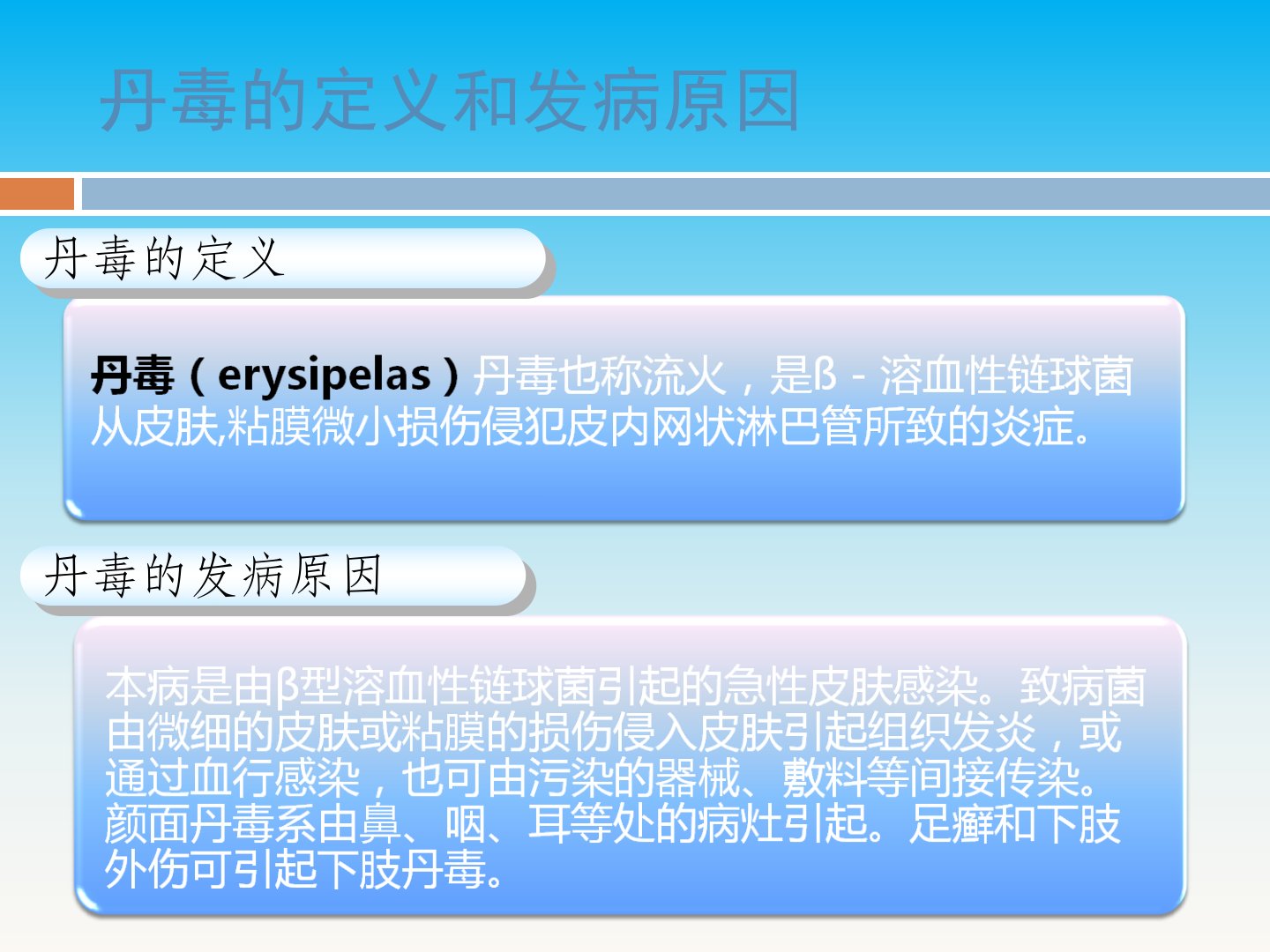 宋时苹医生探讨了外科感染中的丹毒涵盖其定义、发病原因、临床表现、治疗及护理。丹毒好发于足背、小腿、面部起病急皮损为鲜红浮肿性斑片迅速扩大严重时出现水疱或血疱幼儿及体弱者可能继发败血症少数患者可反复发作形成慢性丹毒。以39床患者杨巴图为例其因右下肢皮肤破溃伴创周红肿入院诊断为右下肢软组织感染及皮肤溃疡。治疗原则包括积极抗菌首选青霉素辅以甲硝唑过敏者可用红霉素同时治疗局部病灶如下肢抬高、足癣治疗并配合支持疗法、物理疗法及必要时的手术治疗。护理方面需防治感染、维持正常体温、减轻疼痛、观察和防治并发症如脓毒症和血栓性静脉炎并进行心理护理消除病人焦虑树立战胜疾病的信心。