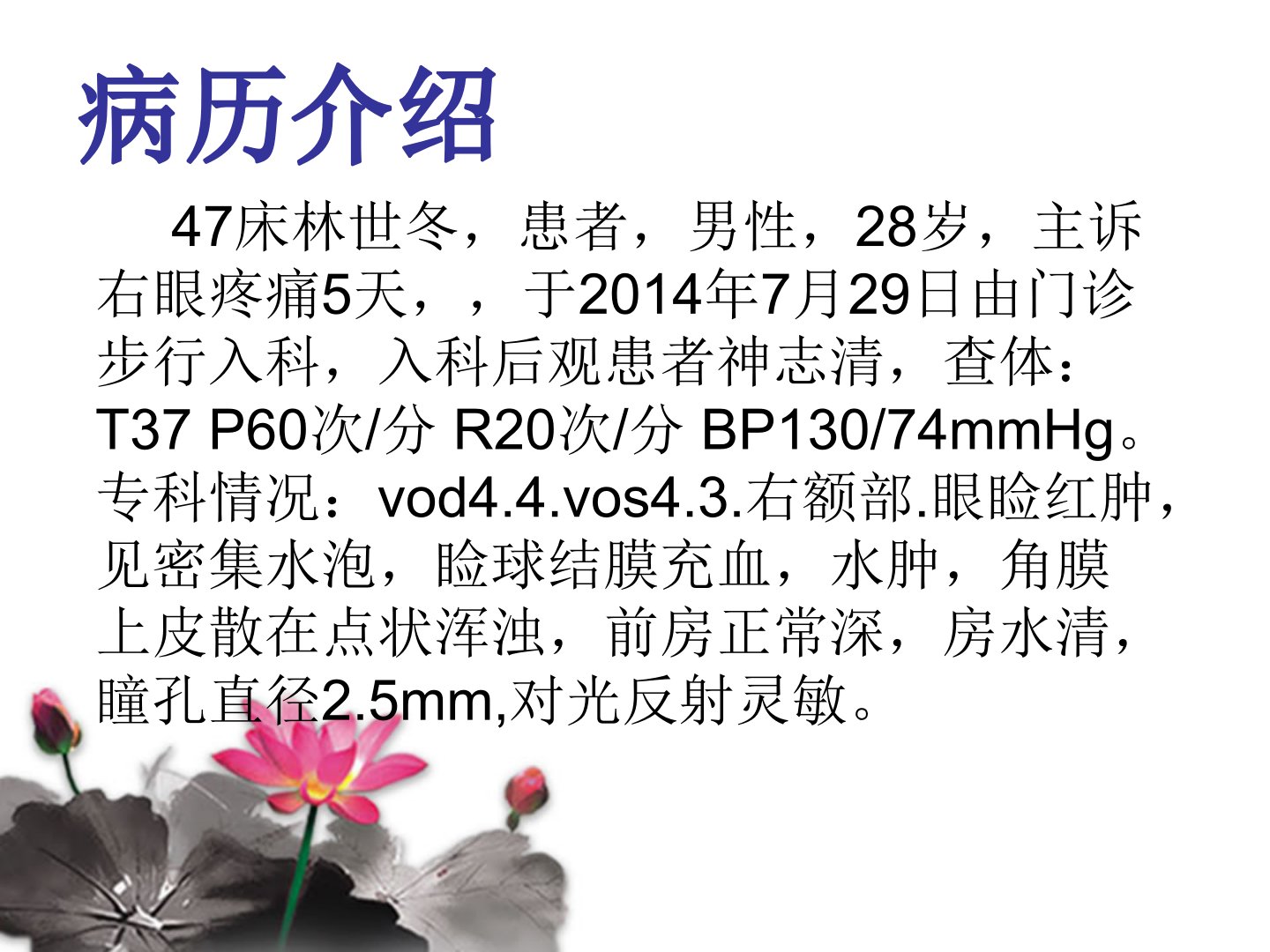 教学查房针对47床28岁男性带状疱疹病人林世冬的护理展开。患者因右眼疼痛5天入科诊断为右眼角膜炎和右额面部带状疱疹。带状疱疹由水痘带状疱疹病毒引起特征为沿单侧周围神经分布的簇集性小水疱伴有明显神经痛。临床表现包括前驱症状、病变区神经痛、潮红肿胀及成簇透明小泡等疱疹分布不越过睑和鼻的中心界限数日后化脓形成深溃疡约2周后结痂脱落留下永久性皮肤瘢痕。治疗上给予抗病毒、营养神经、促进角膜修复及止痛药物适当休息提高机体抵抗力疱疹破溃时局部用药重症患者全身应用药物。护理问题包括疼痛、舒适度改变、皮肤完整性受损危险和焦虑分别采取心理护理、密切观察病情、保持疱疹处消炎干燥、讲解疾病知识等措施。健康教育方面向患者介绍疾病知识强调生活规律、情绪稳定、适当锻炼、合理饮食及正确使用镇痛剂的重要性。
