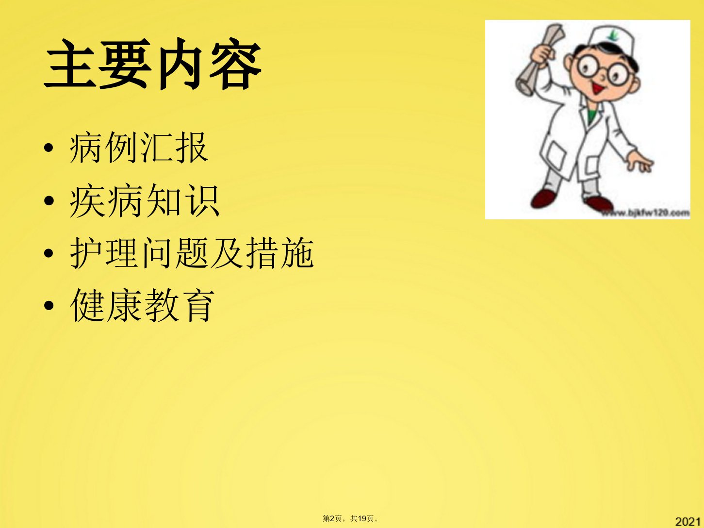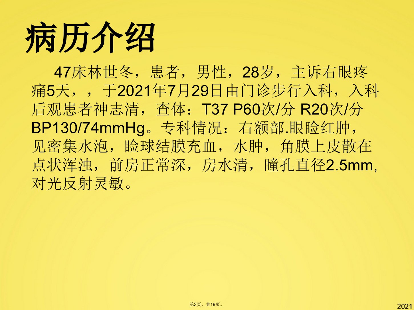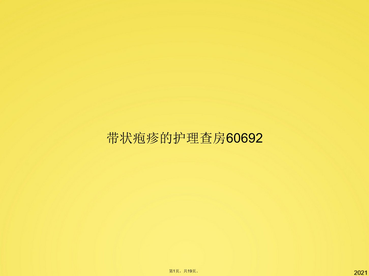 本文为带状疱疹护理查房记录共19页涉及病例汇报、疾病知识、护理问题及措施、健康教育四方面。查房病例为47床28岁男性患者林世冬主诉右眼疼痛5天诊断为右眼角膜炎和右额面部带状疱疹。带状疱疹由水痘带状疱疹病毒引起特征为沿单侧周围神经分布的簇集性小水疱常伴明显神经痛。临床表现包括前驱症状如全身不适、发热随后出现剧烈神经痛病变区皮肤潮红肿胀出现成簇透明小泡数日后化脓形成深溃疡约2周后结痂脱落可能留下永久性皮肤瘢痕还可能并发角膜炎或虹膜炎。治疗包括抗病毒、营养神经、促进角膜修复、止痛及局部治疗。护理问题包括疼痛、舒适度改变、皮肤完整性受损危险及焦虑护理措施涉及心理护理、用药指导、病房环境调整等。健康教育强调生活规律、情绪稳定、适当锻炼、合理饮食及正确使用镇痛剂。