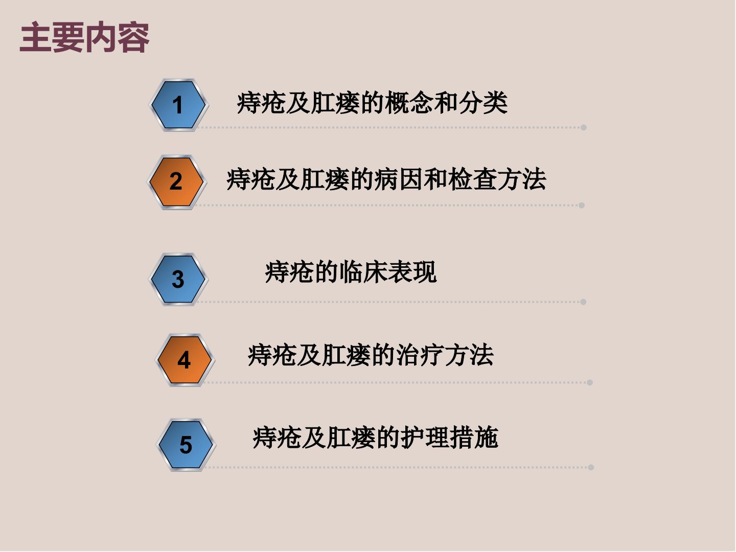 痔疮是肛管处静脉淤血曲张形成的柔软肿物分内痔、外痔和混合痔三类病因包括不良排便习惯、大便异常、感染、饮食、生理结构、职业、胚胎发育及遗传因素等。检查方法包括肛镜、显微或电子结肠镜检等。临床表现主要为无痛性出血和痔块脱出常见于直肠下端特定位置。外痔有结缔组织、静脉曲张性、血栓性、炎性四种症状包括肛门坠胀、疼痛、异物感。混合痔则兼有内痔和外痔症状。治疗包括局部和口服药物、注射、胶圈套扎、血栓性外痔剥离术、传统痔切除术及PPH手术。术前术后护理包括饮食活动调整、热水坐浴、保持肛门清洁等。肛瘘是肛管或直肠与肛周皮肤相通的肉芽肿性管道分低位和高位两类病因主要是细菌感染。治疗包括瘘管切开术、挂线疗法、肛瘘切除术。术前术后护理包括心理护理、饮食调整、备皮、灌肠、观察生命体征、疼痛护理等。