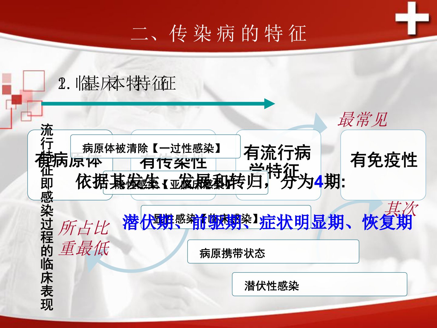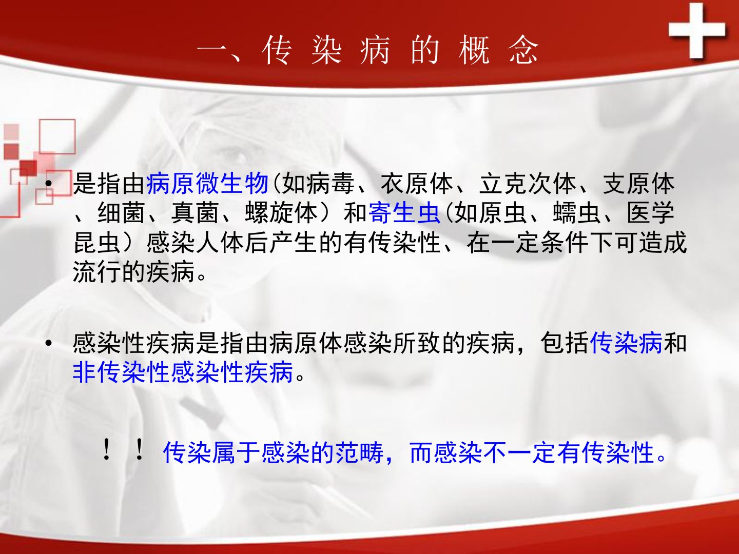 《传染病的护理及自我防护》摘要传染病由病原微生物和寄生虫感染人体后产生具有传染性感染性疾病包含传染病和非传染性感染性疾病。传染病具有基本、临床和流行特征感染过程分潜伏期、前驱期、症状明显期、恢复期。传染病预防需管理传染源遵守传染病报告时限将其分为三类37种管理;要切断传播途径针对不同传播方式采取措施消毒是重要手段;要保护易感人群增强特异性免疫力。传染病隔离标志多样消毒分为疫源地消毒和预防性消毒。常见症状如意识障碍、发热、皮疹和腹泻护理需评估病情明确护理诊断设定护理目标采取休息、饮食、病情观察、降温、皮肤护理等措施。自我防护方面护士面临生物性危害等职业危害因素需增强自我防护意识采取防止锐器伤、洗手消毒、戴手套等防护措施。出现职业暴露时要根据暴露源采取不同应对措施同时要关爱护士提供心理支持改善硬件设施。