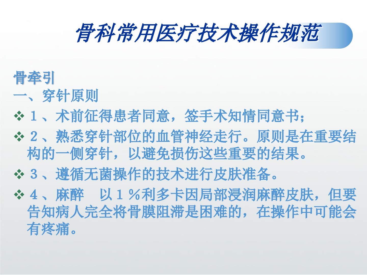常用骨科医疗技术操作规范摘要此PPT介绍了骨科常用医疗技术操作规范。骨牵引方面强调了术前准备如患者同意、熟悉血管神经走行遵循无菌操作、麻醉及皮肤切口等原则穿刺针应位于干骺端避免损伤骺板、骨折血肿及关节。常用骨牵引部位包括胫骨结节、跟骨等。皮牵引通过胶布和皮肤摩擦力传导到骨骼适用于儿童、老人或作为最初、暂时的治疗手段。石膏固定用于骨折脱位等情况需遵循三点固定和水压原则并注意保护骨突起、控制水温等。小夹板制作需具备塑性、韧性、弹性材料就地取材纸压垫有多种形状应用时需外敷膏药、放置纸垫、安放夹板、捆绑布带并注意病人护理。外固定架技术能保持骨折对位、延长肢体等有多种种类使用时需避免损伤血管神经、严格无菌操作等。内固定技术用于四肢等疾患介绍了骨折常用内固定物及脊柱内固定器械种类和适应症。关节穿刺及引流是有创检查和治疗方法介绍了各关节穿刺部位及方法。局部注射疗法有消炎止痛作用介绍了适应症、使用药物方法和注意事项。