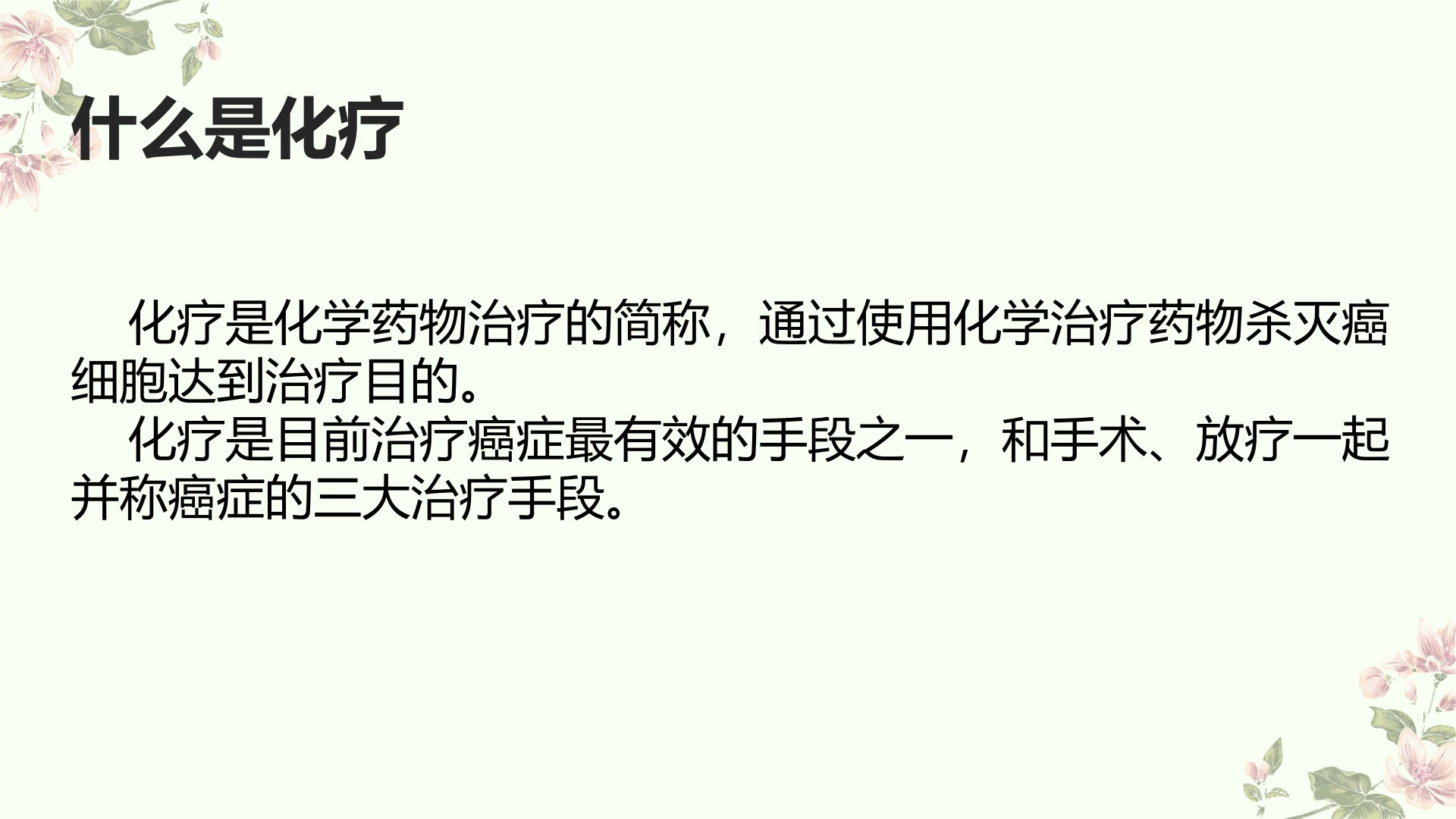 2020年11月2日资料显示化疗是化学药物治疗简称是治疗癌症最有效手段之一与手术、放疗并称癌症三大治疗手段。化疗药物给药途径多样包括静脉、腔内、椎管内、动脉插管及口服化疗。消化肿瘤内科收治多种癌症患者化疗药物存在不良反应需细致护理。如培美曲塞需提前口服叶酸、肌注维生素B12减轻反应;氟尿嘧啶外渗可致局部疼痛甚至坏死需注意输注时间;卡培他滨、吉西他滨、紫杉醇等药物也各有其适应症、用法、配置要求及护理要点。化疗禁忌包括患者身体情况差、有严重器官功能障碍、早期癌症已手术、多次化疗耐药无效及对化疗药物不敏感等情况。化疗前、中、后均需细致护理包括确认知情同意书、双人核对排药、做好个人防护、合理调节输液速度等。化疗药物外渗是重要风险需紧急处理包括停止注射、局部封闭、冰敷或湿敷等了解化疗药物渗透的原因、预防及处理方法十分重要。