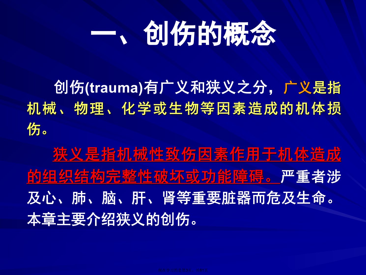 关于常见创伤的护理现在学习的是第1页,共81页概述随着工业交通的现代化,创伤对人类提出了巨大的挑战。在美国,创伤死亡是44岁以下首位死因。在我国城市,创伤是第五位死因,在农村则为第四位死因,可见创伤对人类的生存和健康已构成了巨大的威胁。因此,伤后正确的急救和护理对伤员的存活至关重要。现在学习的是第2页,共81页一、创伤的概念创伤(trauma)有广义和狭义之分,广义是指机械、物理、化学或生物等因素造成的机体损伤。狭义是指机械性致伤因素作用于机体造成的组织结构完整性破坏或功能障碍。严重者涉及心、肺、脑、肝、肾等重要脏器而危及生命。本章主要介绍狭义的创伤。现在学习的是第3页,共81页二、创伤分类(...
