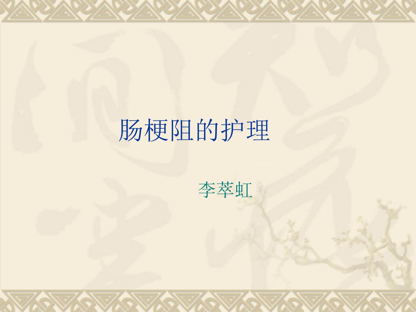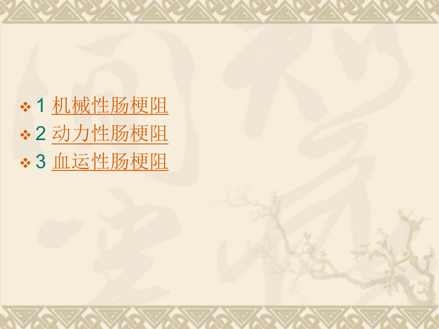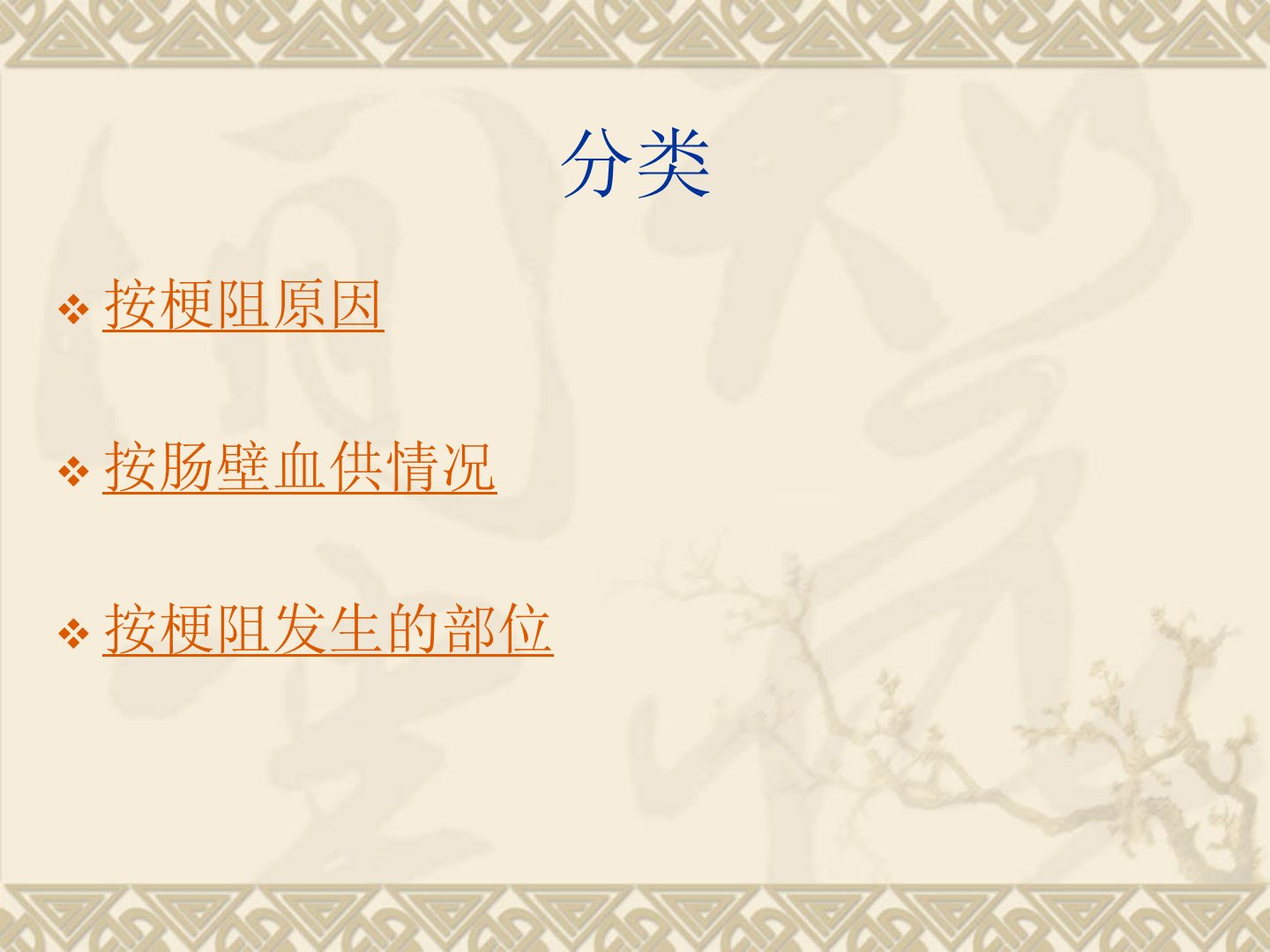 肠梗阻可根据原因、血供、部位分类。最常见的是机械性肠梗阻占急性肠梗阻的90以上主要由肠粘连、肿瘤等因素造成。动力性肠梗阻则因肠壁肌肉活动紊乱引起分为麻痹性和痉挛性两种。按肠壁血供情况肠梗阻可分为单纯性和绞窄性后者因肠壁血管被绞窄而缺血坏死。按部位肠梗阻分为小肠梗阻和结肠梗阻前者又可细分为高位和低位。程度和起病缓急上肠梗阻有完全性、不完全性、急性和慢性之分。肠梗阻主要症状包括腹痛、呕吐、腹胀、停止排便排气严重时可致休克。体征主要有腹部膨胀、肠鸣音亢进或消失、肠型和蠕动波、腹部压痛、腹块等。治疗包括基础治疗和解除梗阻两大方面前者包括纠正水、电解质紊乱等后者分手术和非手术两种。护理包括非手术和术后护理以及健康教育。常见类型有粘连性、肠扭转、肠套叠和蛔虫性肠梗阻。