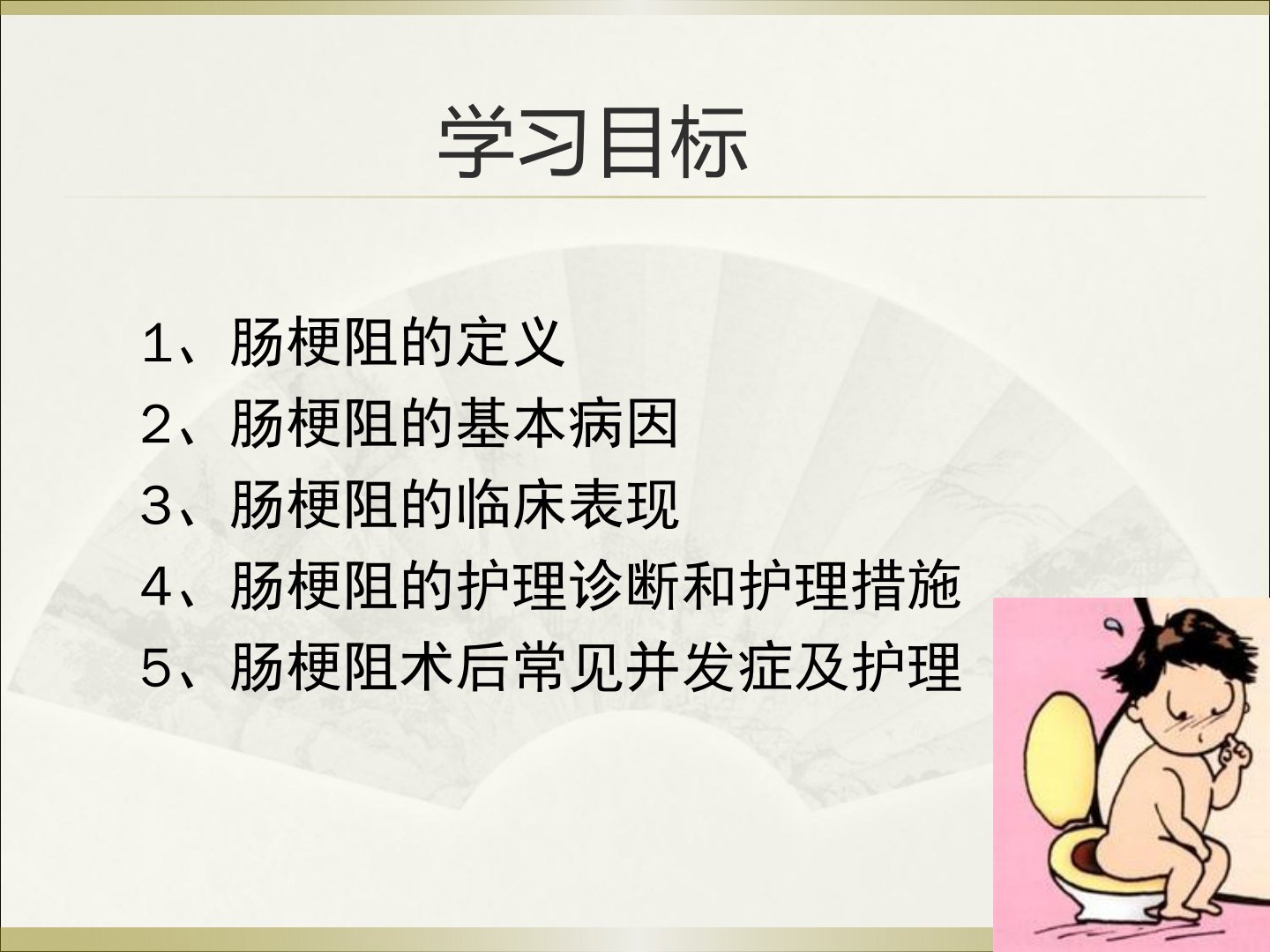 肠梗阻病人的护理学习摘要本次学习目标是了解肠梗阻的定义、病因、临床表现、护理诊断、护理措施及术后并发症护理。肠梗阻指部分或全部肠内容物不能正常流动通过肠道是常见急腹症90发生于小肠可分为动力性、血运性、机械性肠梗阻。机械性肠梗阻常见病因有粘连、肠扭转和肠套叠、肿瘤等。其临床表现包括痛(单纯性机械性肠梗阻为反复发作的节律性绞痛绞窄性持续性加重)、吐(高位早而频繁低位晚且为粪汁样物)、胀(低位或麻痹性明显)、闭(完全性停止排便排气)。非手术治疗包括禁食、胃肠减压等手术治疗解除梗阻。护理诊断有体液不足、疼痛等需维持体液平衡、缓解疼痛、控制体温。术后常见并发症有吸入性肺炎、腹腔感染等要做好预防及病情监测术后保持引流通畅鼓励早期活动出院后注意饮食等。
