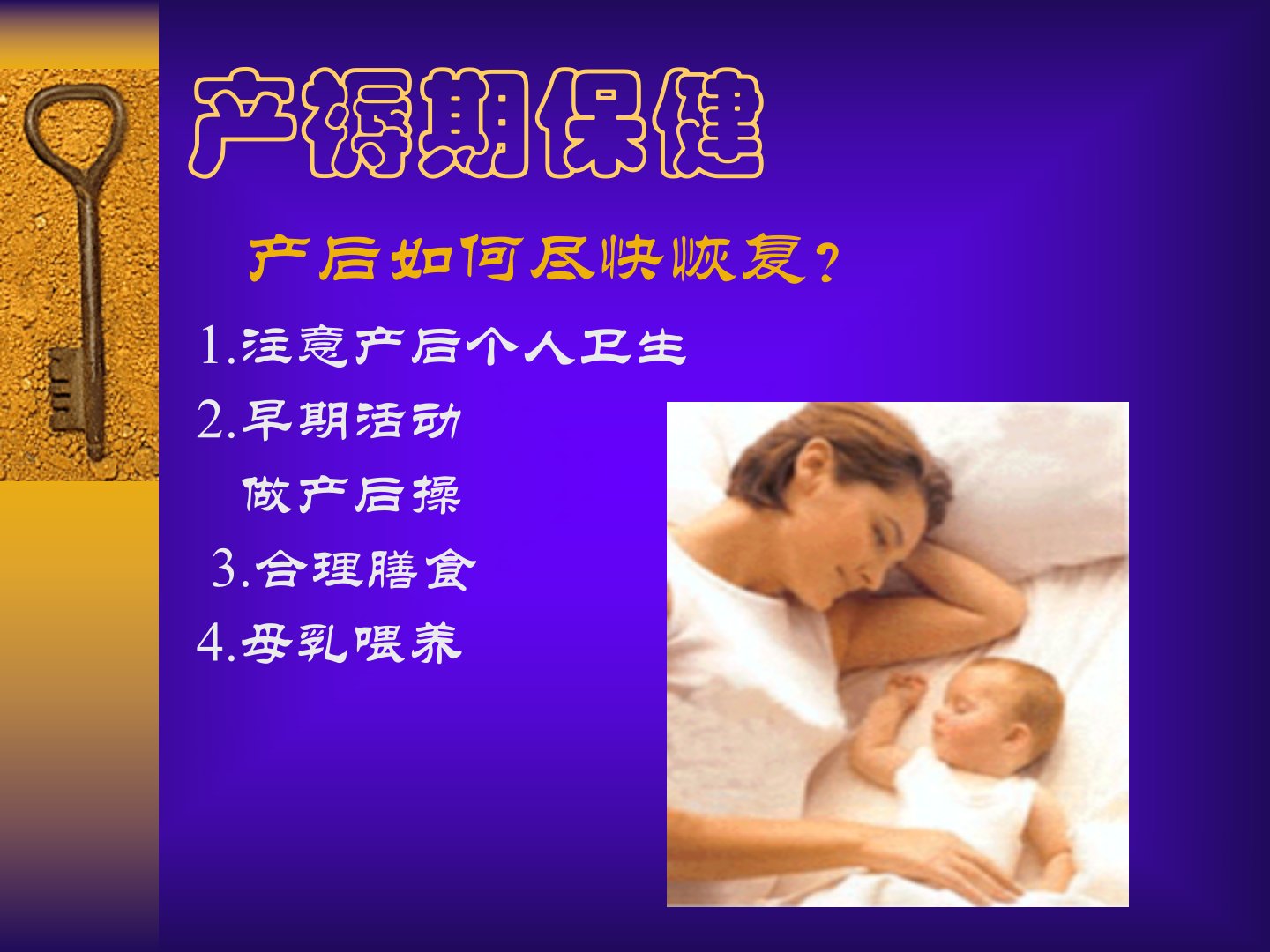 产褥期是产妇分娩后到机体和生殖器基本复原的68周时期民间俗称坐月子此阶段产妇需注意身体调理。产褥期保健要点包括:注意个人卫生选用软毛牙刷勤擦身、洗澡、换衣物;早期活动顺产产后612小时、剖宫产产后第2天去除导尿管后开始同时保证每天10小时睡眠;做保健操从产后第2天开始逐渐增加节数和次数直至产后6周;合理膳食多吃富含蛋白质、钙的食物荤素搭配初期宜清淡易消化后逐渐增加营养注意补充维生素和矿物质产妇每日热量需求约3000千卡;积极避孕产后2个月内禁性生活推荐使用避孕套、阴道隔膜等哺乳期内不能采用避孕药物;保持心情愉快需要一个安静舒适的休养环境。新生儿护理方面需了解新生儿分类、正常足月儿特点、特殊生理状态及护理措施包括维持体温稳定、保持呼吸道通畅、预防感染、合理喂养、确保安全及健康教育。同时提醒产后42天需到医院检查并列举了母乳喂养的禁忌症与非禁忌症。