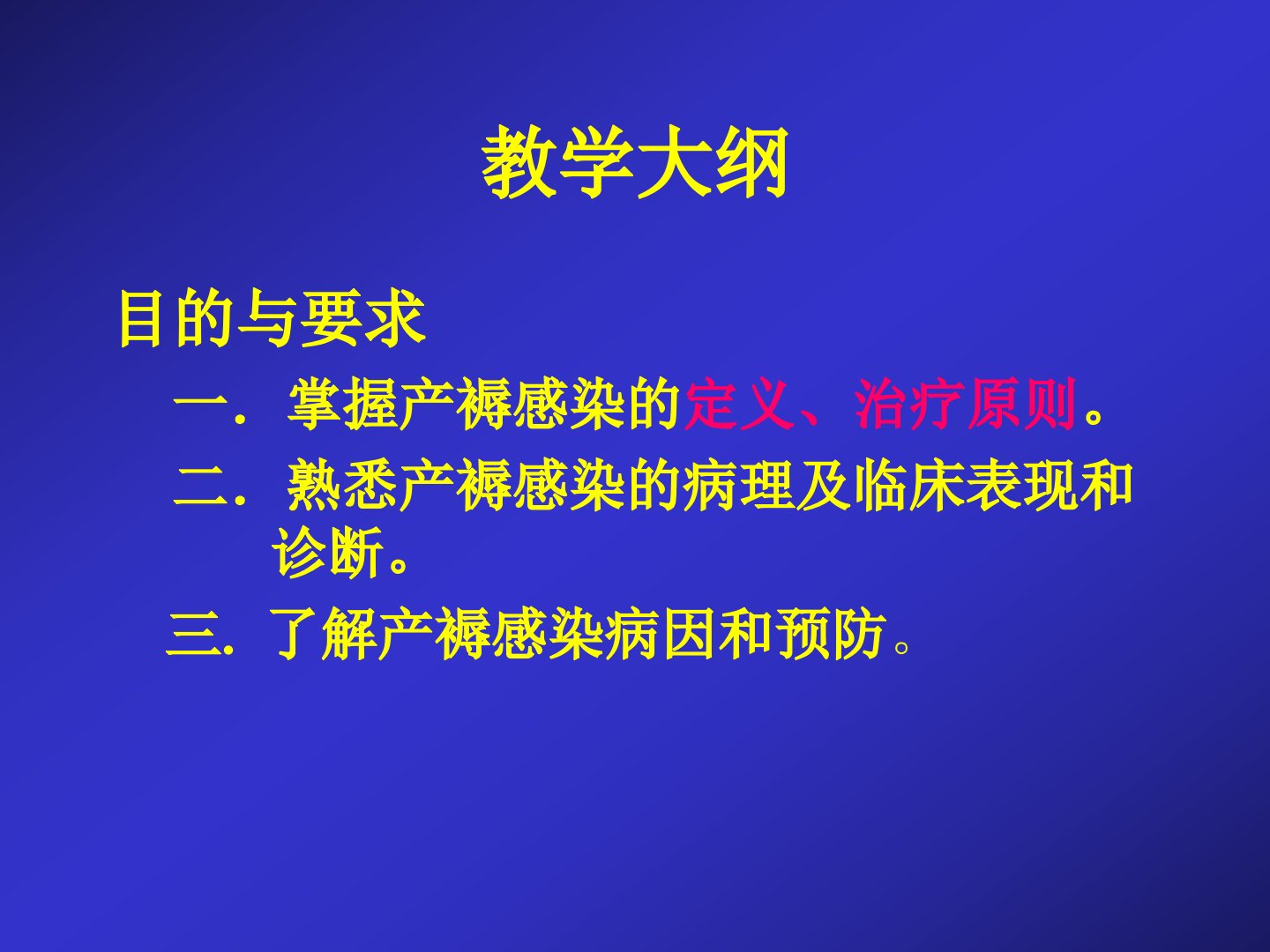 产褥感染教学大纲摘要目的与要求掌握产褥感染定义、治疗原则;熟悉病理、临床表现与诊断;了解病因和预防。教学内容1定义:产褥期生殖道受病原体感染引发局部或全身感染;分娩24小时后10日内每日间隔4小时测温2次2次体温38为产褥病率原因包括产褥感染及生殖道外感染。2病因:病原体种类、数量、毒力及机体防御能力影响感染;贫血等多种因素成诱因;病原体分外源(性传播疾病)和内源(生殖道寄生菌)以厌氧菌为主。感染途径有外源性和内源性。3临床及病理:表现为发热、疼痛、异常恶露三大症状涵盖多种炎症类型。4诊断:详询病史进行全身及局部检查通过B超等辅助检查确立病原体。5鉴别诊断:与上呼吸道感染、急性乳腺炎等鉴别。6治疗:支持疗法、切开引流、清除宫腔残留物、应用抗生素、血栓静脉炎用肝素、严重病例手术。7预防:加强孕期卫生临产前治疗炎症注意无菌操作必要时用抗生素。思考题产褥感染三大主要症状、诊断要点。给出相关病案要求做出诊断和处理。