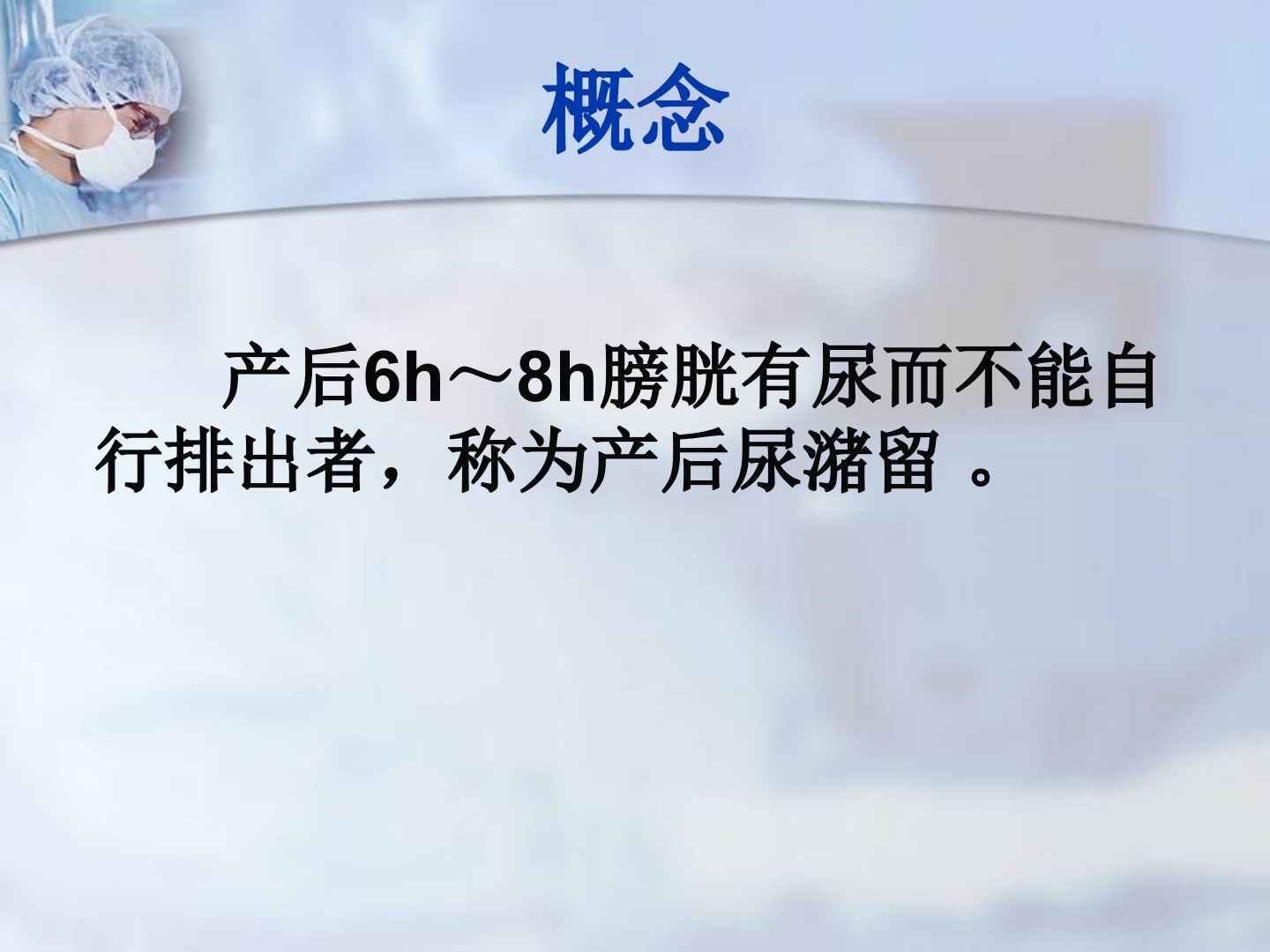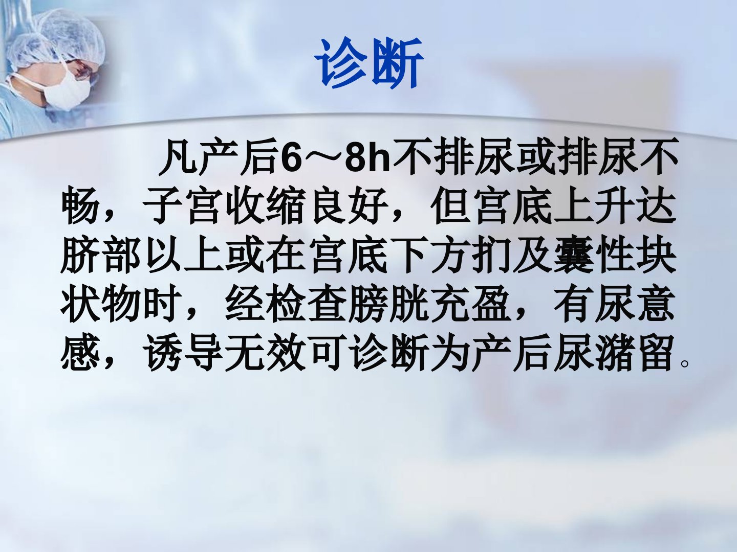 产后68h膀胱有尿而不能自行排出即为产后尿潴留其诊断依据包括:产后68h不排尿或排尿不畅、子宫收缩良好但宫底上升达脐部以上、在宫底下方扪及囊性块状物、膀胱充盈有尿意感但诱导无效。产后尿潴留会影响子宫收缩导致阴道出血量增多增加产妇痛苦是造成产后泌尿系统感染的重要因素。其发病原因包括:产妇不习惯床上排尿、膀胱和尿道受胎先露压迫过久、腹壁松弛腹压下降、产后会阴创伤疼痛、病人惧怕疼痛而不敢用力排尿、产前或产程中应用大剂量解痉镇静药降低膀胱张力等。预防措施包括:产前排尿训练、心理护理、分娩期正确操作、针对不适应床上排尿的病人嘱其缓慢下床排尿、产后及时督促排尿、解除伤口疼痛、加强病房巡视、剖宫产术后留置尿管产妇的护理等。简便的诱导排尿法包括:听流水声、热敷法、按摩法、温水冲洗会阴、热气熏蒸外阴部等。处理方法包括:红外线照射排尿法、按压膀胱排尿法、开塞露塞肛法、灌肠法、口服柳树叶法、肌肉注射新斯的明或酚妥拉明、穴位应用法、留置导尿管法等。干预措施是否有效与产妇尿潴留原因分析和护理方法有密切关系要根据其原因采取相应的护理措施。