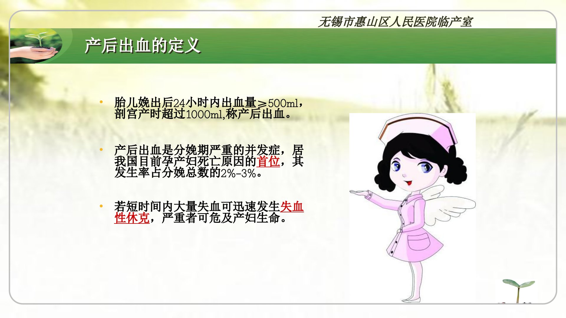 产后出血的护理摘要产后出血指胎儿娩出后24小时内出血量超500ml(剖宫产超1000ml)是分娩期严重并发症居我国孕产妇死亡原因首位。其病因多样最常见为子宫收缩乏力(占7080)包括全身性因素如产妇精神紧张、使用镇静剂等致体力衰竭局部因素如子宫过度膨胀、肌纤维发育不良等;胎盘因素有胎盘滞留、黏连植入、部分残留;软产道裂伤因子宫收缩过强、胎儿过大、接产不当等引起;凝血功能障碍较少见包括妊娠合并疾病及妊娠并发症导致两类情况。临床表现主要为阴道流血量过多及失血性休克症状体征。诊断通过产后失血量测定与估计、腹部检查、软产道检查、胎盘检查等。处理原则是针对原因迅速止血、补充血容量、纠正休克及防治感染。护理包括预防产后出血针对原因止血纠正失血性休克控制感染心理护理与健康教育等。预防需妊娠期定期产检分娩期各产程注意要点产后密切观察等。