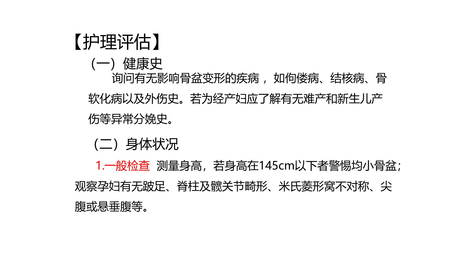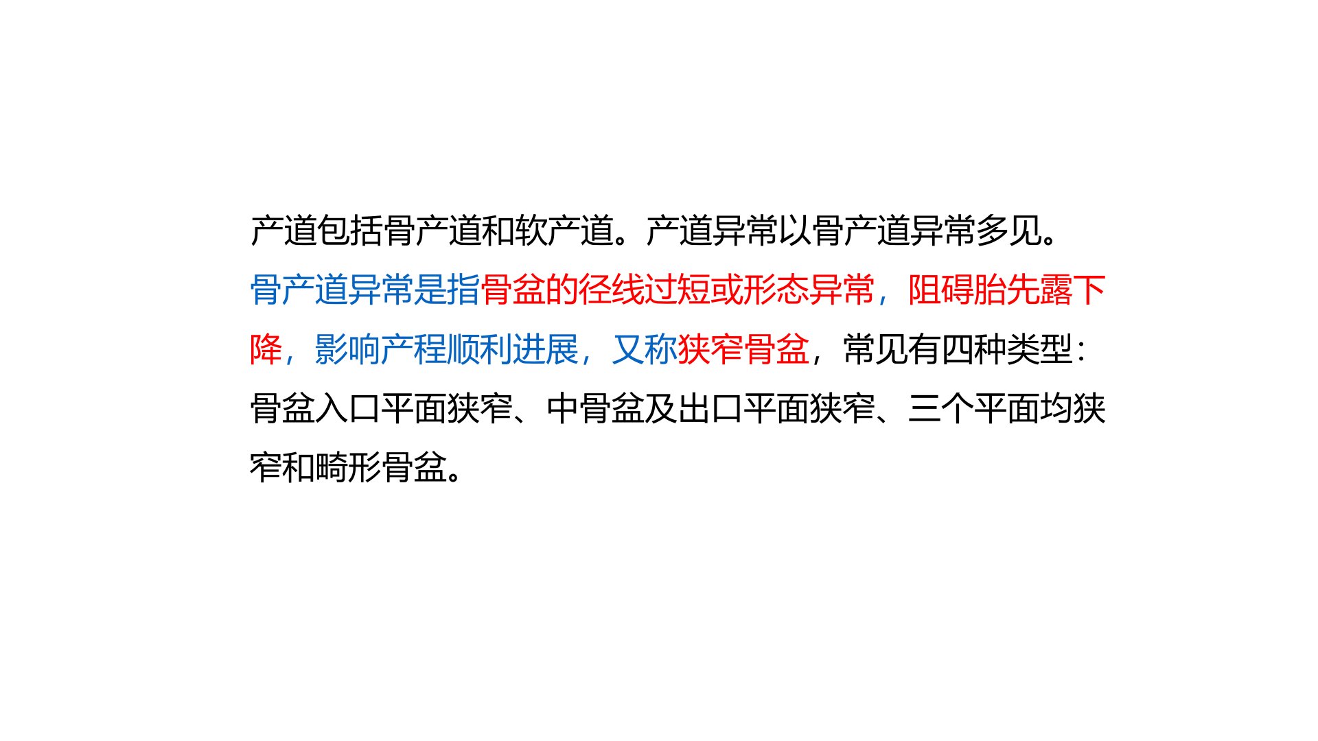 产道异常病人的护理产道包括骨产道和软产道其中骨产道异常多见指骨盆径线过短或形态异常阻碍胎先露下降常见有四种类型。1护理评估:询问健康史有无影响骨盆变形疾病及异常分娩史;身体状况包括一般检查(测量身高观察孕妇体征)、腹部检查(观察腹型、跨耻征检查、骨盆测量);妇科检查了解软产道有无异常;评估对母儿影响易致产程延长、胎儿窘迫等;借助B超辅助检查;综合判断决定分娩方式。2护理诊断:产妇、围生儿有受伤危险有感染危险潜在并发症胎儿窘迫、新生儿窒息。3护理目标:产妇平安分娩降低围生儿受伤风险减轻焦虑预防控制感染及时发现处理并发症。4护理措施:防止受伤依情况协助试产或准备手术;减轻焦虑讲明影响告知进展;防治感染注意无菌操作产后观察护理;防治并发症观察宫缩等情况;做好健康指导。5护理评价:产妇配合度、母儿分娩情况、胎儿状况、产妇产后情况及感染预防效果。感谢大家的聆听!
