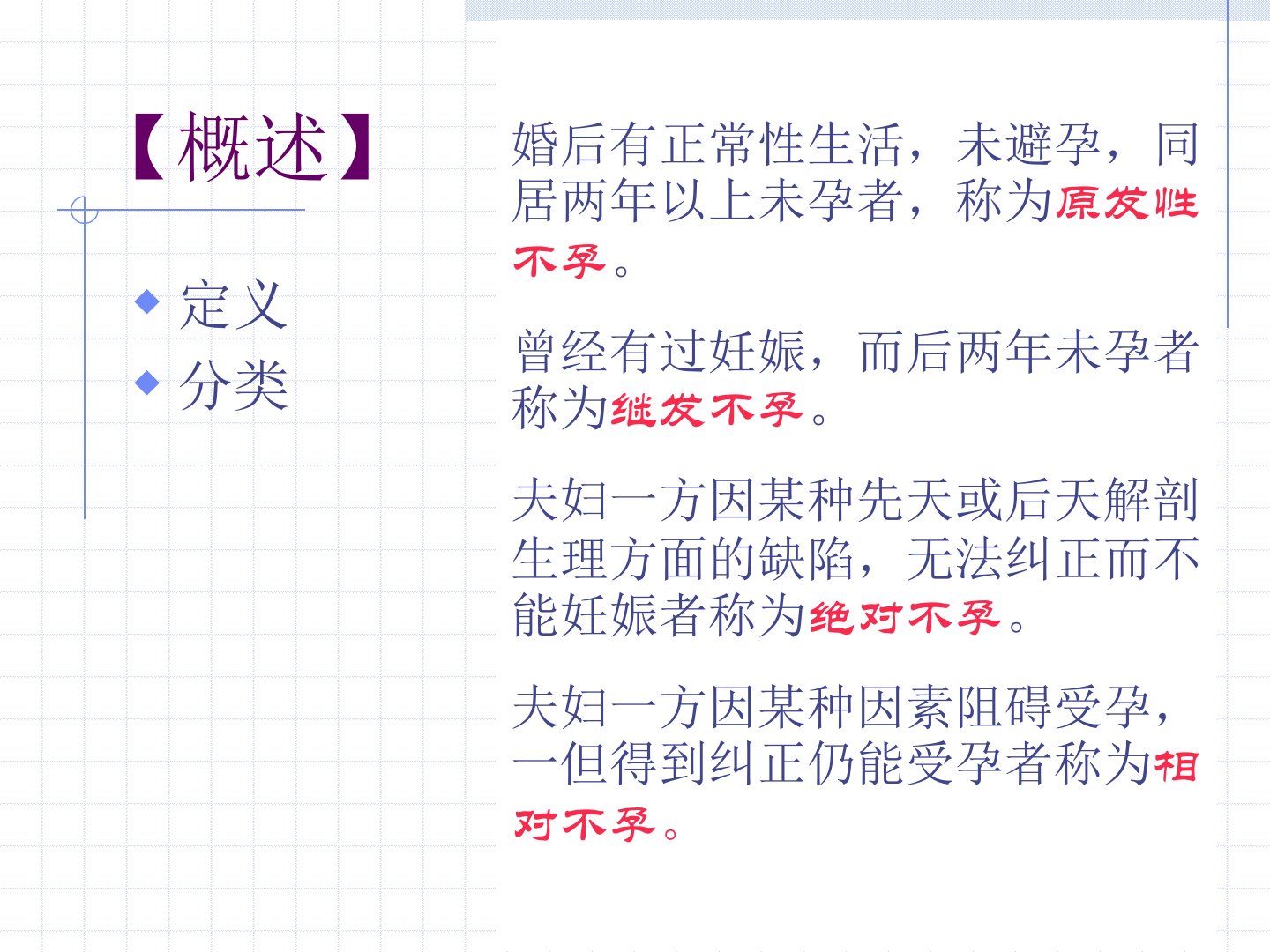 婚后正常性生活未避孕同居两年未孕为原发性不孕曾有妊娠而后两年未孕为继发不孕。不孕原因包括绝对不孕与相对不孕。不孕因素中女性约占40病因有外阴阴道、宫颈、子宫、输卵管等因素及排卵障碍;男性占40病因有精子生成、运送障碍免疫、内分泌功能障碍等;男女双方因素占10不明原因占10。治疗上一般处理包括改变不良习惯、解除思想负担等治疗原则为病因治疗、治疗器质性疾病、诱发排卵等。护理评估包括病史、症状、体征及辅助检查。心理社会评估方面不孕会给妇女内心及婚姻造成冲击还可能导致知识缺乏、自尊紊乱等问题。预防不孕症需普及性知识、预防生殖器官炎症、保持好心情、做好避孕等。此外还列举了不孕症相关选择题。