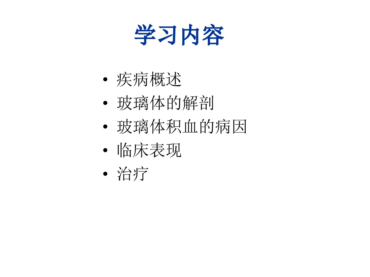 玻璃体积血指周围组织血管破裂血液流入无血管的玻璃体腔。玻璃体位于晶状体后具屈光、固定视网膜作用。病因包括:1外伤如眼球穿通伤、钝挫伤等;2自发性如脉络膜视网膜的炎性、变性或肿瘤性疾病;3糖尿病病人眼底新生血管;4手术如白内障手术等。临床表现上少量积血有飞蚊症状或视力障碍大量积血则视力骤降眼底检查可见玻璃体内漂浮物积血机化物可能牵拉视网膜导致网脱或继发青光眼。治疗方面多数病例玻璃体出血自发吸收需46个月治疗前应观察34个月。药物治疗多用尿激酶玻璃体内注射复方中药制剂疗效待评。物理疗法效果有限手术治疗如玻璃体切除术适用于眼外伤病例早期手术可避免血液过度刺激减少并发症。护理上需关注患者感知紊乱、焦虑、自理缺陷等问题嘱患者绝对卧床休息半卧位包扎双眼给予清淡易消化饮食讲解疾病知识进行健康指导。