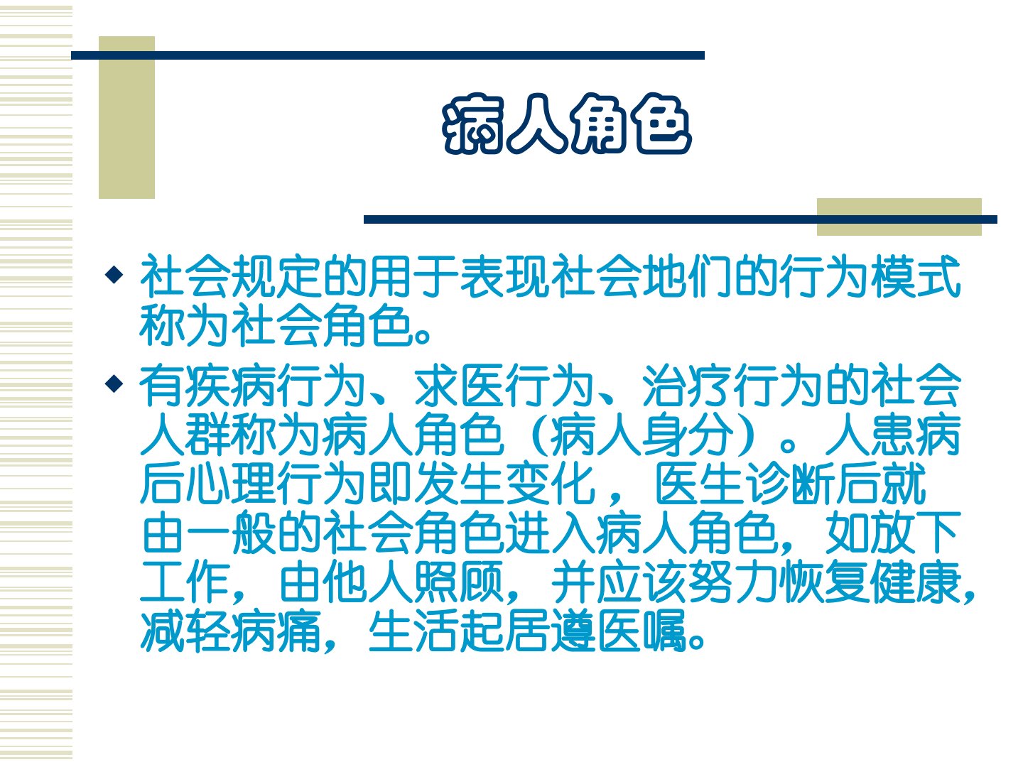 湖南中医药高等专科学校刘红云老师讲述了病人心理与心理护理相关内容。病人角色指有疾病、求医、治疗行为的社会人群患病后心理行为会发生变化。病人拥有享受医疗护理、保守秘密、了解诊疗信息等多项权利同时也有及时就医、遵守医嘱等义务。病人角色可能存在行为缺如、冲突、减退等变化常见焦虑、退化等心理问题。心理护理是根据医护心理学理论通过人际交往影响或改变病人心理状态和行为促进其康复。其对象包括临床病人、疗养院人员等目标是满足病人合理要求、消除不良情绪等。心理护理遵循交往、启迪、针对性、自我护理等原则通过评估、计划、实施、评价四个步骤进行。其中儿童病人心理活动随治疗情境变化快心理护理要对家长心理支持;老年病人突出表现为无价值感和孤独感心理护理要耐心温和。此外针对焦虑、抑郁、疼痛等不同心理问题以及急性病人、术前术后病人、危重病人等不同情况需采取针对性心理护理措施。