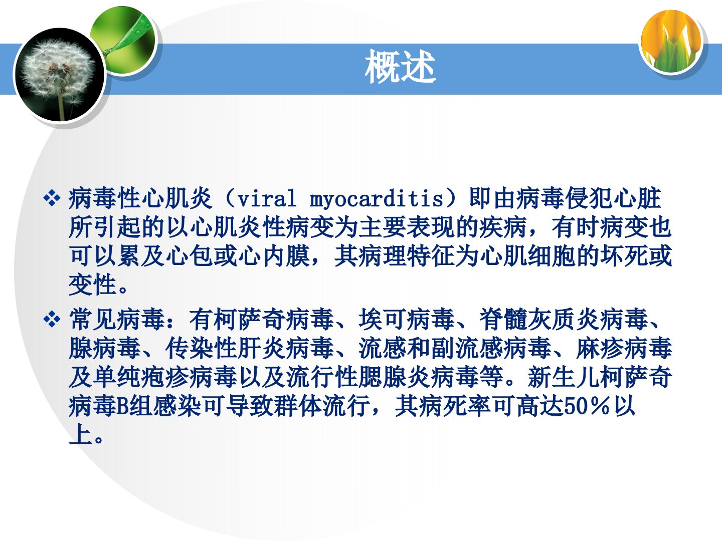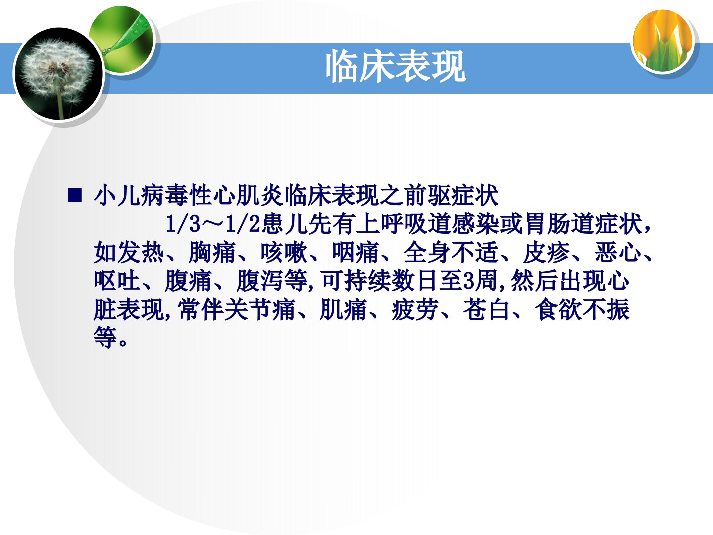 病毒性心肌炎由病毒侵犯心脏引起以心肌炎性病变为主有时可累及心包或心内膜常见病毒包括柯萨奇病毒、腺病毒等。新生儿柯萨奇病毒B组感染病死率极高。临床表现上小儿患者前期多有上呼吸道感染或胃肠道症状随后出现心脏表现如关节痛、疲劳等。轻者可能仅心电图异常一般病例则表现为精神不振、乏力等。重症病例可能出现水肿、气急、心功能不全甚至急性心源性休克、猝死等。护理方面首先要休息以减轻心脏负担急性期需卧床休息恢复期继续限制活动量。饮食上要清淡易消化、营养丰富少食多餐。同时要严密观察病情及时发现和处理并发症。用药时需注意点滴速度避免加重心脏负担。此外保持大便通畅避免用力排便预防措施包括预防病毒性感染、提高身体抗病能力、保持室内空气新鲜等。