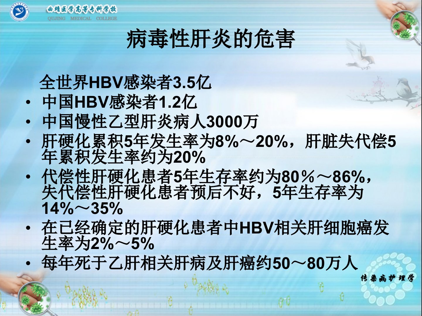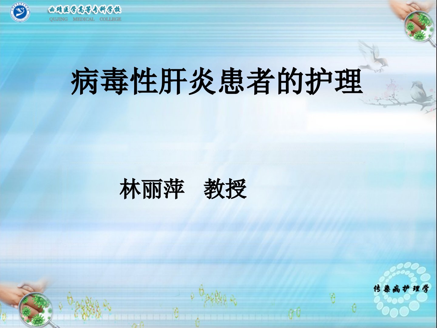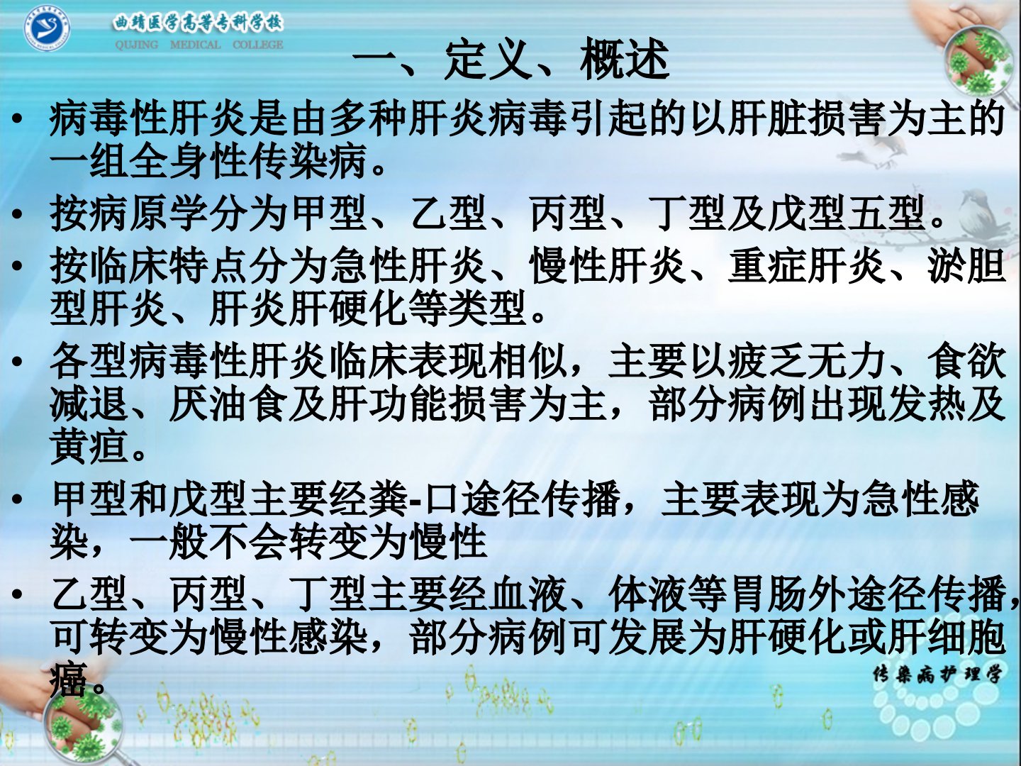 病毒性肝炎患者的护理摘要林丽萍教授阐述了病毒性肝炎相关知识。该病由多种肝炎病毒引起按病原学分为甲、乙、丙、丁、戊五型按临床特点分为急性、慢性、重症、淤胆型、肝炎肝硬化等类型临床表现相似甲型和戊型主要经粪口途径传播一般不会转变为慢性乙、丙、丁型经血液、体液等传播可转慢性甚至发展为肝硬化或肝细胞癌。病原学方面介绍了HAV、HBV、HCV、HDV、HEV的特点。流行病学上传染源、传播途径、人群易感性各有不同乙肝有地区、性别差异以散发为主。发病机制因肝炎类型而异病理表现多样病理生理涉及黄疸、肝性脑病等多种情况。临床表现分急性、慢性、重症肝炎等并发症有肝内、肝外及重型肝炎并发症。辅助检查包括肝功能和病原学检查。治疗要点因肝炎类型不同而有所区别同时强调控制传染源、切断传播途径、保护易感人群。护理包括评估健康史、体检等主要护理问题多样护理措施涵盖生活护理(隔离、休息、饮食、日常卫生)、意识障碍护理、出血护理、肝肾综合征护理、继发感染护理、用药护理、病情观察与并发症监测及心理护理。