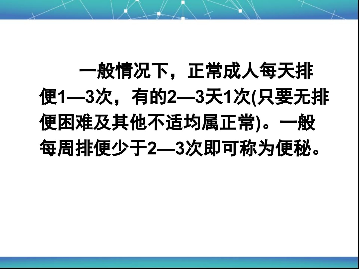 《便秘》摘要本文围绕便秘展开介绍了多方面知识:1概念:正常排便形态改变每周排便少于23次即可称便秘。2排便反射过程:食糜残渣经肠蠕动到结肠形成粪便运送至直肠直肠黏膜受刺激产生冲动经神经传导使直肠肌收缩、肛门括约肌松弛腹肌与膈肌收缩排出粪便任一环节障碍均可致便秘。3分类及病因:功能性便秘病因包括进食量少或食物缺乏纤维素、排便习惯受干扰、结肠运动功能障碍、腹肌及盆肌张力不足、结肠冗长、药物影响等;器质性便秘病因有结肠痉挛、肿瘤压迫、直肠或肛门疾病、全身性疾病等。4处理措施:器质性便秘针对病因治疗重建排便习惯合理安排膳食;功能性便秘鼓励适当运动提供适当排便环境选取适宜排便姿势进行腹部环形按摩遵医嘱用药无效时灌肠。5扩展知识:介绍了通便的饮食、便秘六字诀等知识。