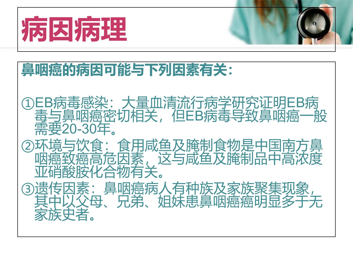 鼻咽癌一、定义二、病因病理三、临床表现四、辅助检查五、治疗六、护理措施定义鼻咽癌是指发生于鼻咽粘膜的恶性肿瘤。中国的广东、广西、福建、湖南等地为多发区,男多于女。发病年龄大多为中年人,亦有青少年患病者。病因病理鼻咽癌的病因可能与下列因素有关:①EB病毒感染:大量血清流行病学研究证明EB病毒与鼻咽癌密切相关,但EB病毒导致鼻咽癌一般需要20-30年。②环境与饮食:食用咸鱼及腌制食物是中国南方鼻咽癌致癌高危因素,这与咸鱼及腌制品中高浓度亚硝酸胺化合物有关。③遗传因素:鼻咽癌病人有种族及家族聚集现象,其中以父母、兄弟、姐妹患鼻咽癌癌明显多于无家族史者。常吃咸鱼易致鼻咽癌 据科学分析,烂咸鱼是一种直...