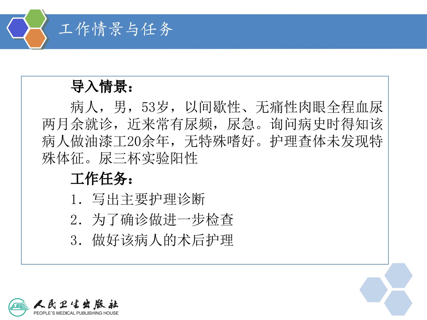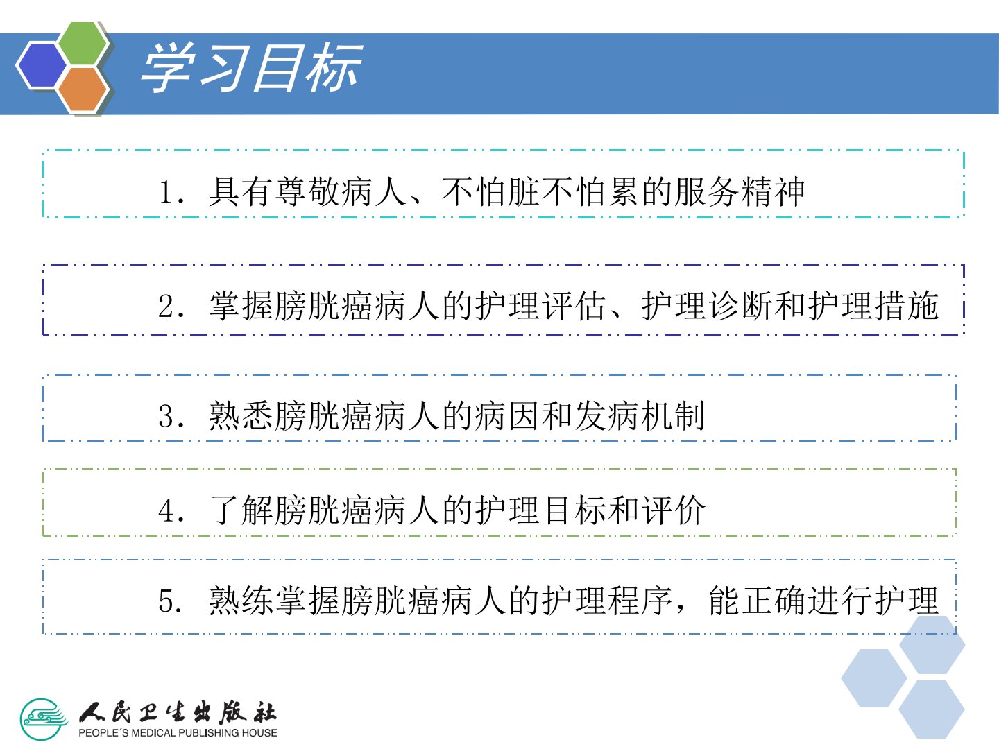 《第九章肿瘤病人的护理》第九节摘要本节由高仁甫主讲旨在让学习者熟练掌握膀胱癌病人的护理程序培养其尊敬病人、不怕脏累的服务精神。膀胱肿瘤是泌尿系统最常见的肿瘤男性发病率高于女性病因包括接触致癌物质、吸烟、癌前病变等。膀胱癌病人常见症状为血尿、膀胱刺激症状、排尿困难晚期可出现腰骶部疼痛、肾积水等症状。病人多因血尿紧张害怕担心术后形象改变而焦虑恐惧。辅助检查包括实验室检查、影像学检查和膀胱镜检查。治疗以手术为主辅以化疗、放疗等。常见护理诊断包括焦虑恐惧、急性疼痛、营养失调等。护理措施涵盖术前术后术前注重心理护理、病情观察术后根据不同手术方式进行导尿管、引流管、饮食等护理化疗病人需进行膀胱灌注化疗及并发症护理。此外还要做好健康指导包括定期复查、生活指导、造瘘护理等。护理评价关注病人心理、疼痛、体重、自我情绪调整及并发症情况。