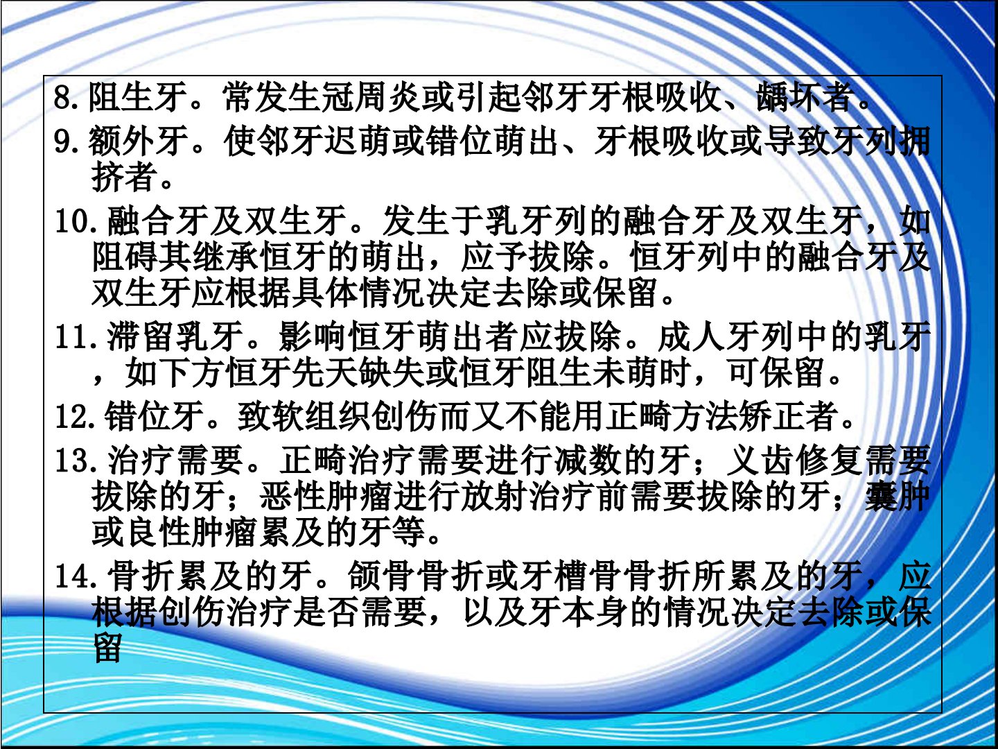 拔牙的护理1.龋病。牙体严重广泛的龋坏而不能有效治疗利用者。2.根尖病。根尖周围病变,不能用根管治疗、根尖切除等方法治愈者。3.牙周病。晚期牙周病,牙周骨组织已大部分破坏,牙极为松动者。4.隐裂牙、牙根纵裂及创伤性磨牙根折者。5.牙外伤。如牙根折断且折断线与口腔相通,难以治疗利用者。6.牙内吸收牙。髓腔壁吸收过多或穿通者。7.埋伏牙。引起邻牙疼痛或压迫吸收时,在邻牙可以保留的情况下可拔除。8.阻生牙。常发生冠周炎或引起邻牙牙根吸收、龋坏者。9.额外牙。使邻牙迟萌或错位萌出、牙根吸收或导致牙列拥挤者。10.融合牙及双生牙。发生于乳牙列的融合牙及双生牙,如阻碍其继承恒牙的萌出,应予拔除。恒牙列中的...