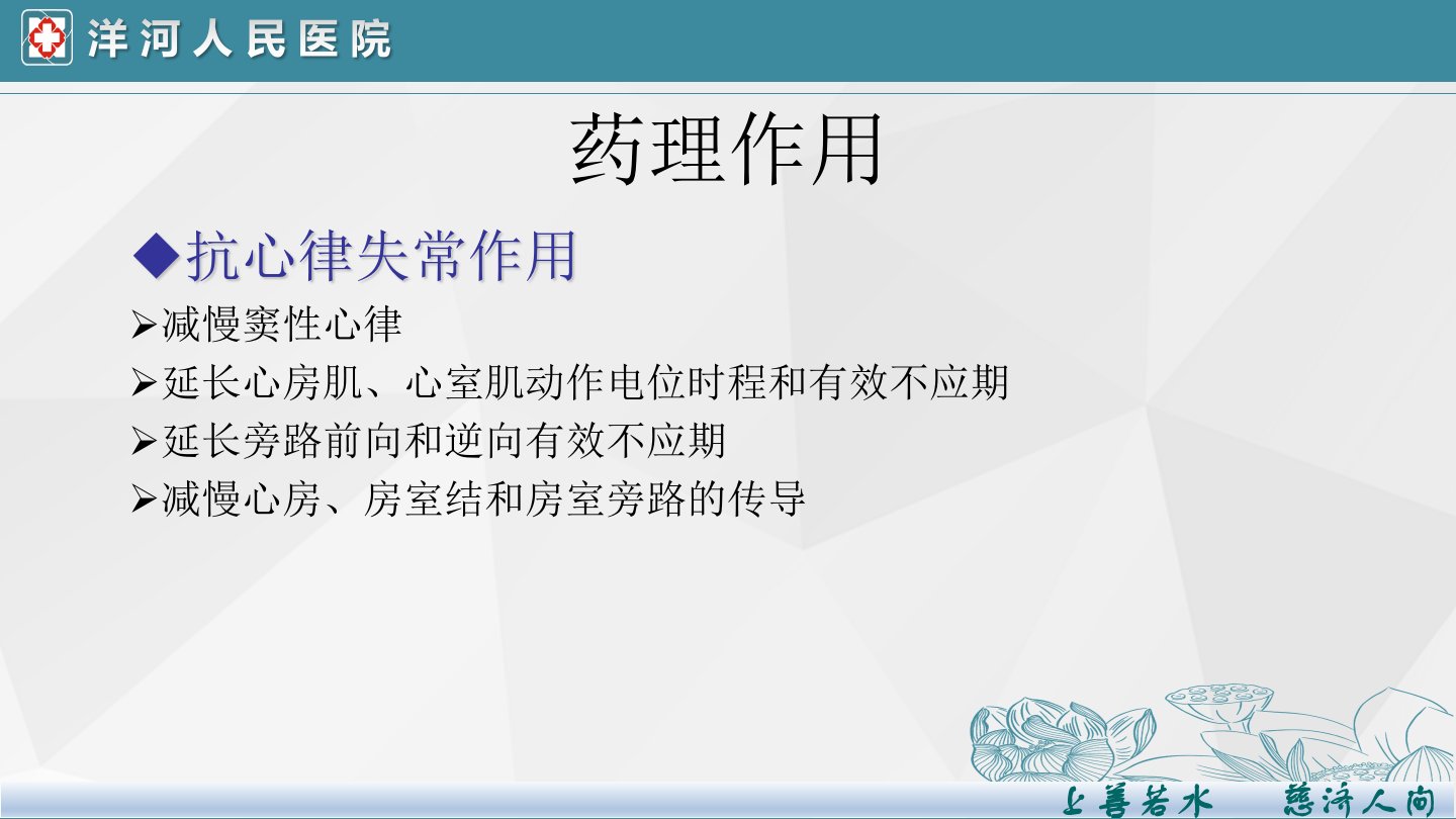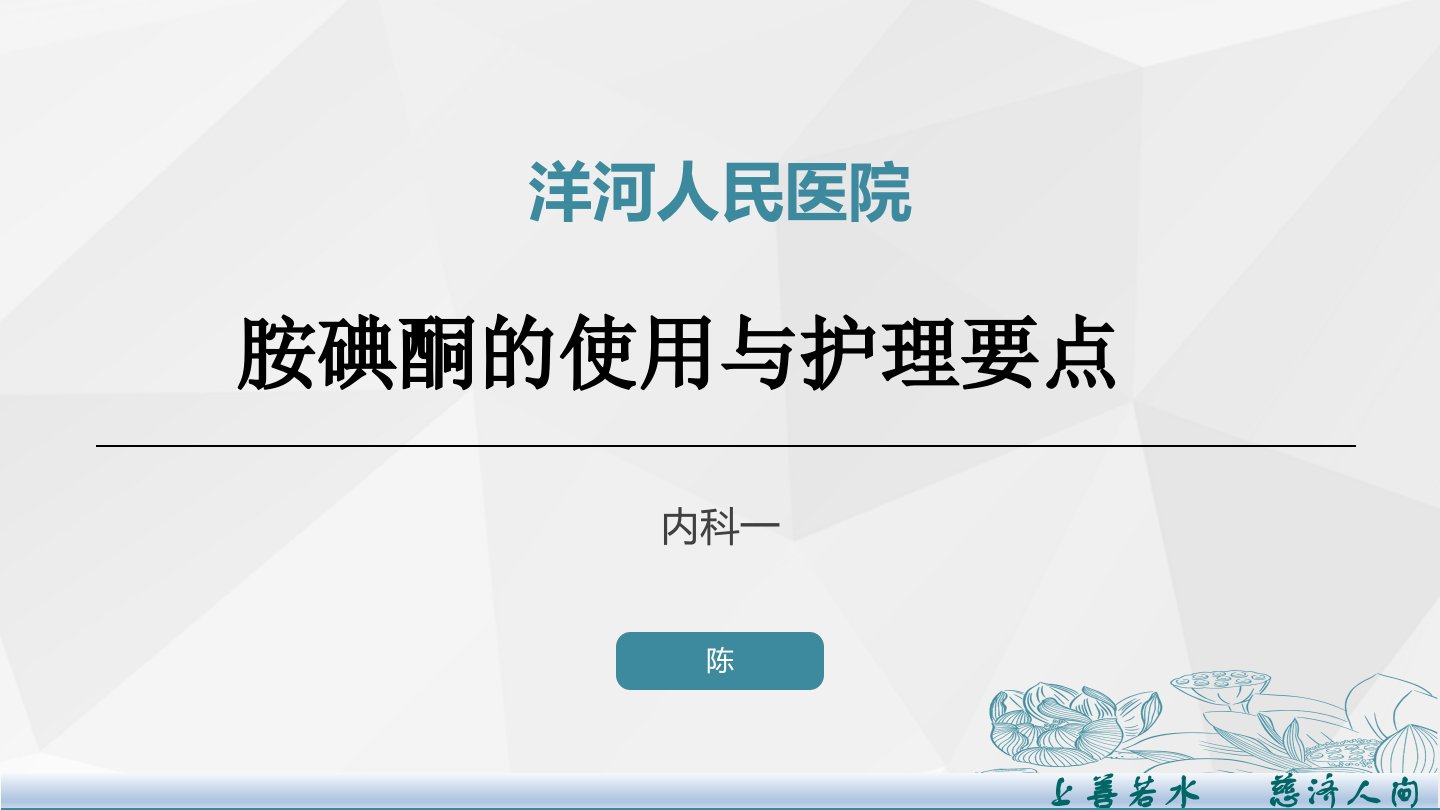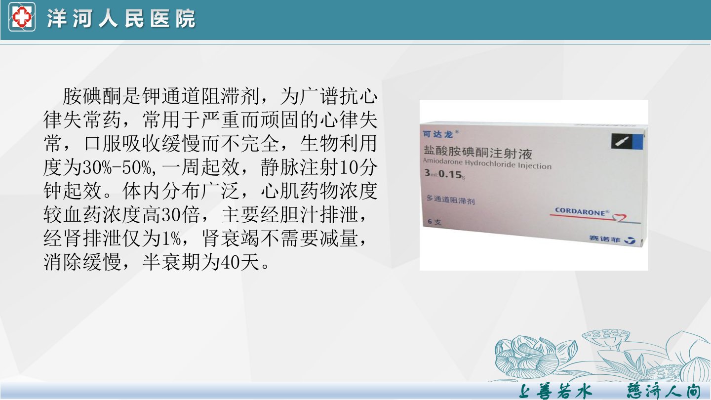洋河人民医院的陈医生介绍了胺碘酮的使用与护理要点。胺碘酮是广谱抗心律失常药口服吸收慢生物利用度低一周起效静脉注射10分钟起效主要经胆汁排泄。药理作用包括减慢窦性心律、延长心肌动作电位时程等适用于多种心律失常尤其对心房扑动、心房颤动等疗效显著也适用于冠心病并发的心律失常。临床应用上静脉注射需稀释后缓慢推注静脉滴注有负荷量和维持量之分。但静脉注射胺碘酮易引发静脉炎与药物浓度、理化因素等有关。不良反应包括心脏、甲状腺、胃肠道等多方面问题。禁忌症包括窦性心动过缓、病窦综合征等未安置起搏器的患者及甲状腺机能亢进患者等。注意事项包括纠正低钾血症、定期检查肝功能等。护理上需严格按医嘱稀释药液选用合适血管控制滴数加强巡视及时处理静脉炎等。静脉炎护理措施包括硫酸镁湿敷、紫草油外敷、金黄散外敷等多种方法。