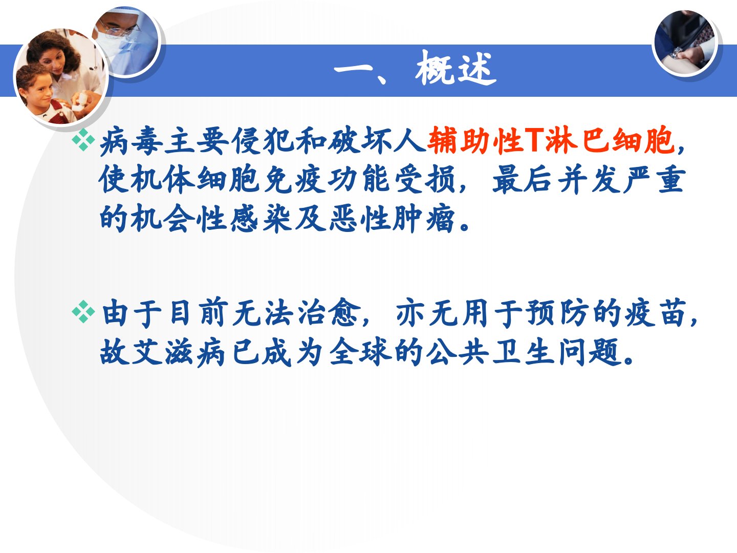 第五节艾滋病病人的护理一、概述艾滋病(AIDS)获得性免疫缺陷综合征,是由人免疫缺陷病毒(HumanImmunodeficiencyVirus,HIV)引起的致命性慢性传染病。主要通过性接触和血液传播。HIV一、概述病毒主要侵犯和破坏人辅助性T淋巴细胞,使机体细胞免疫功能受损,最后并发严重的机会性感染及恶性肿瘤。由于目前无法治愈,亦无用于预防的疫苗,故艾滋病已成为全球的公共卫生问题。历史回顾1981年在美国纽约发现首例1983年法国巴斯德研究所发现相关病毒1986年正式命名为人免疫缺陷病毒1985年我国发现第一例艾滋病患者。1989年10月,云南瑞丽吸毒人群中发现146例艾滋病感染者,系从境外...
